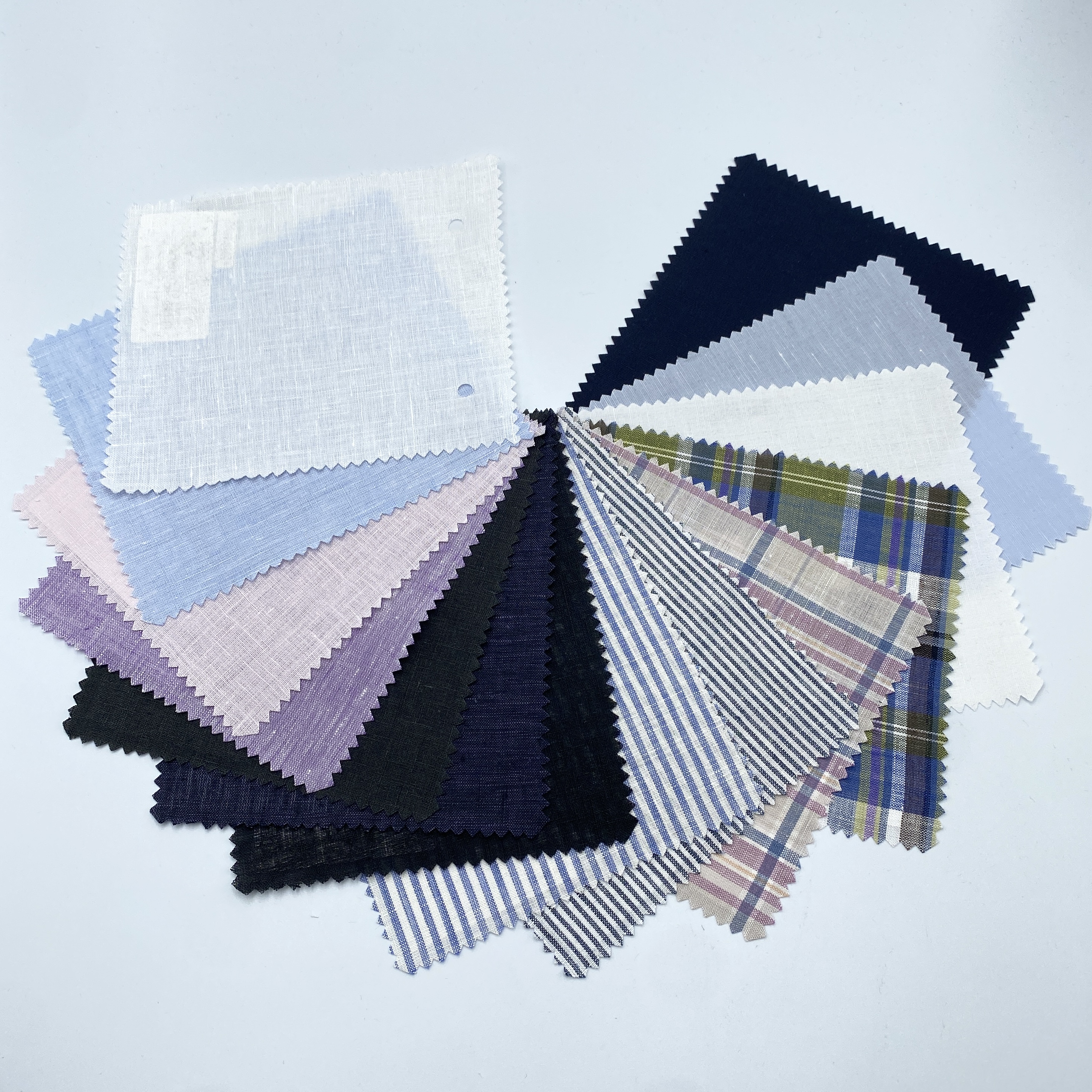 品質は100% Linen、糸番手は経糸(タテイト)・緯糸(ヨコイト)ともに60番手単糸(タンシ)、カラーは左上からBlack/Navy Blue/Dark Green/Purple/Pale Pink/Light Blue/Whiteです。