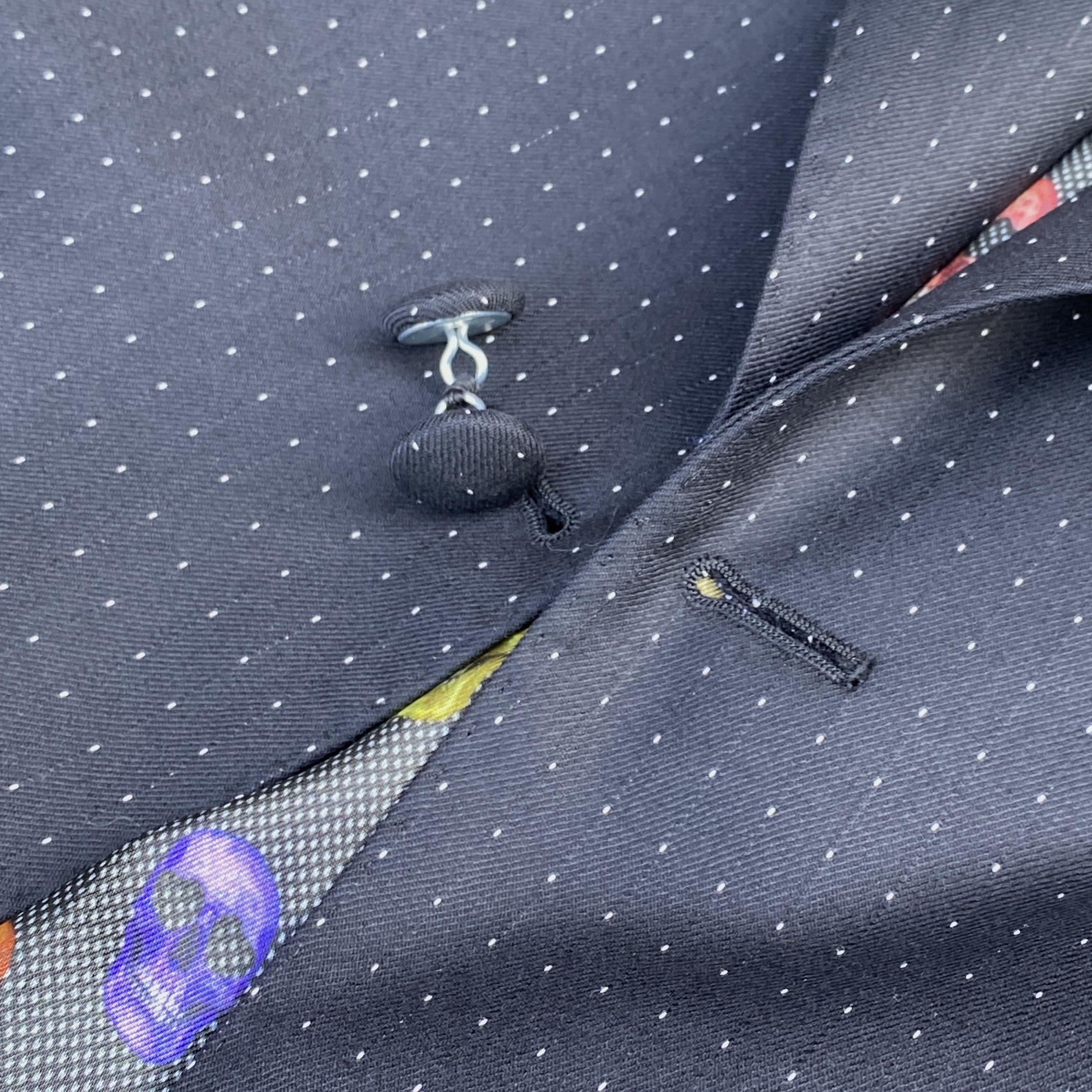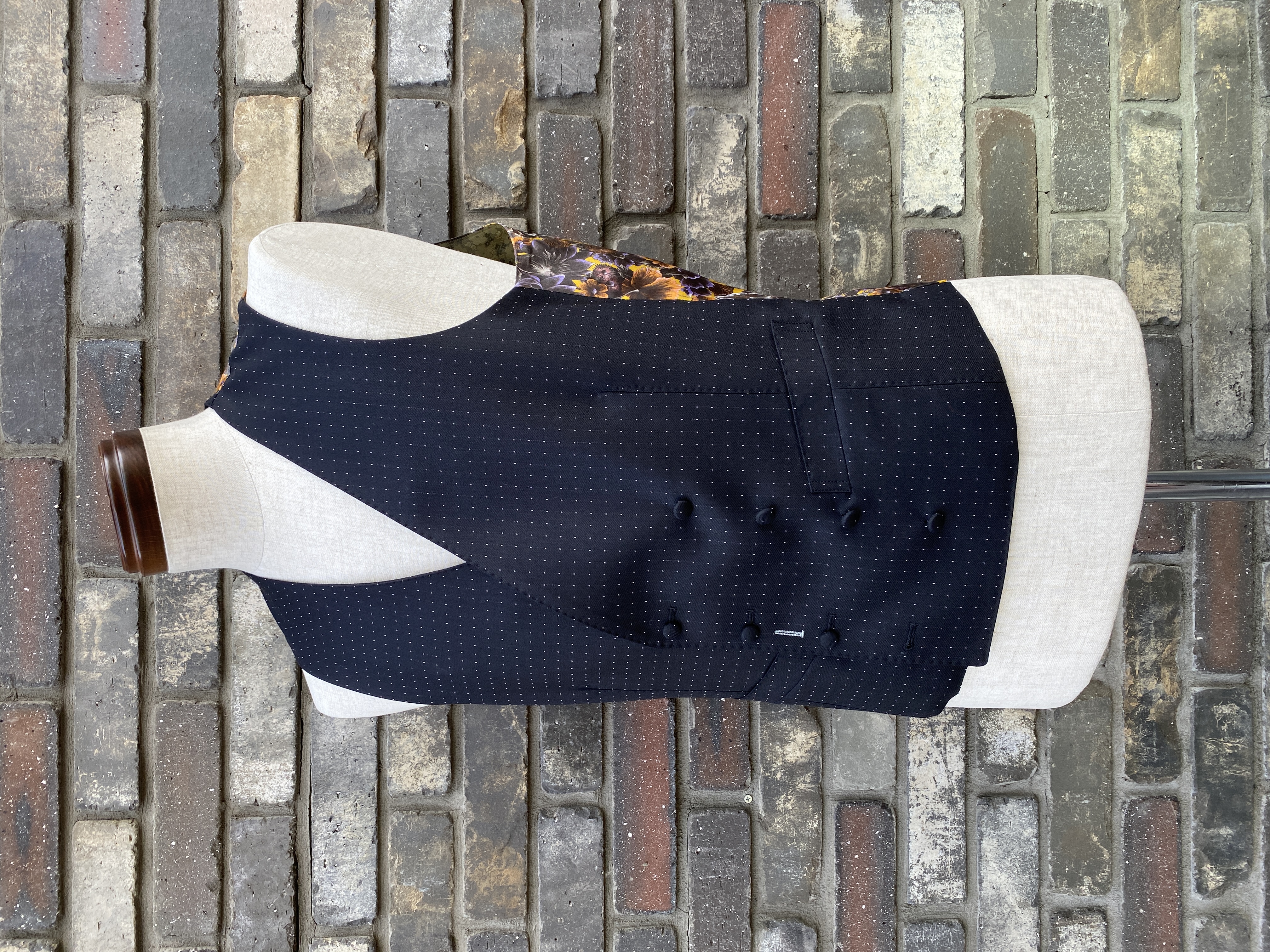 ボタンはmade in JapanのNavy Blueに染め上げたリアルナット(ヤシの実)ボタン、ライニングは100% CuproボディのItalianプリントライニングにしました。