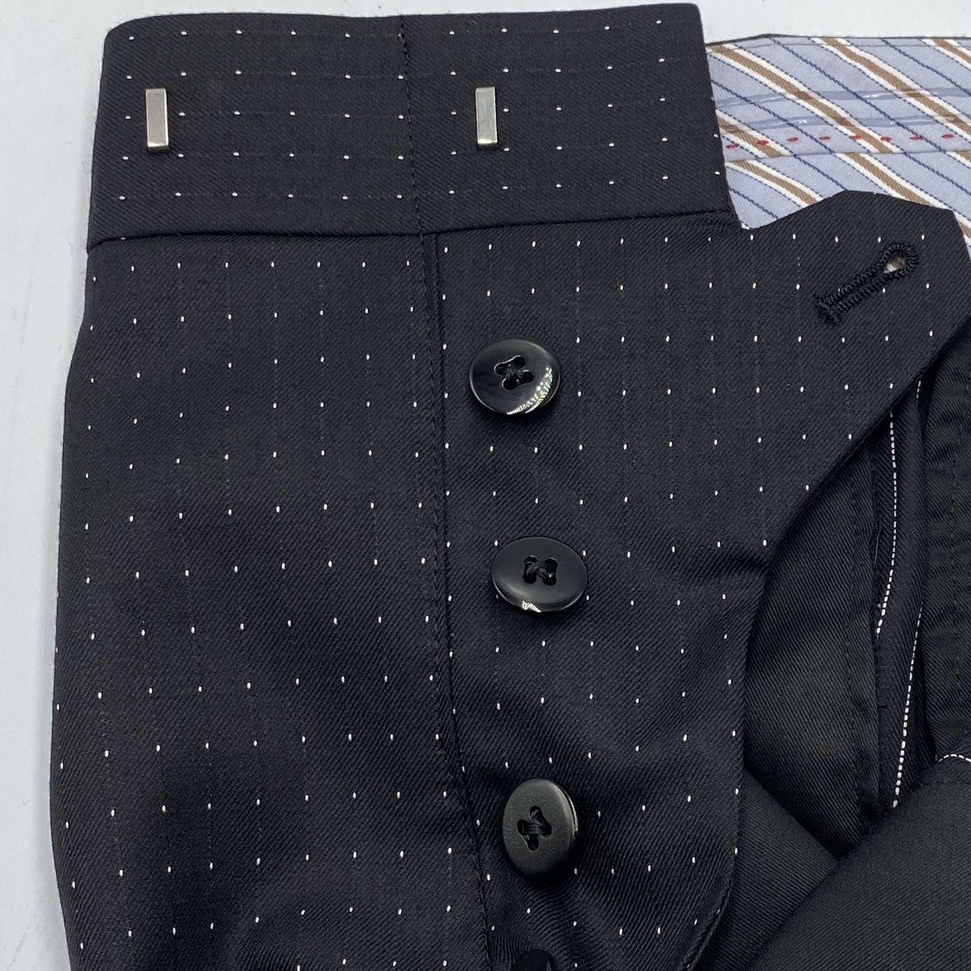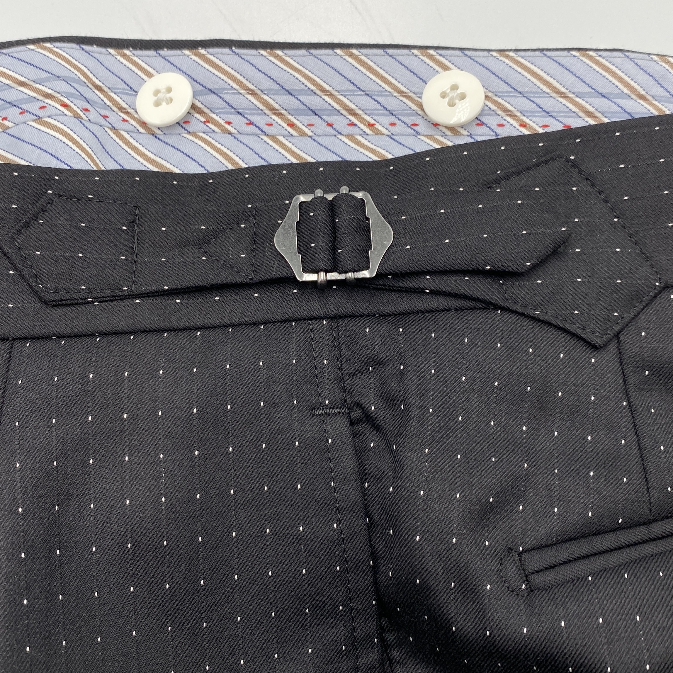 具体的には「ややナロウ巾:7.5cm&ハイゴージーラインのピークトラペル + シングルブレステッド2ボタン + ウェルト(箱)仕様のチェストポケット + 4.5cmとやや急アングルのハッキング/スランテッド仕様のウェストポケット + モダンクラシックフロント + サイドヴェンツ」でお作りしました。