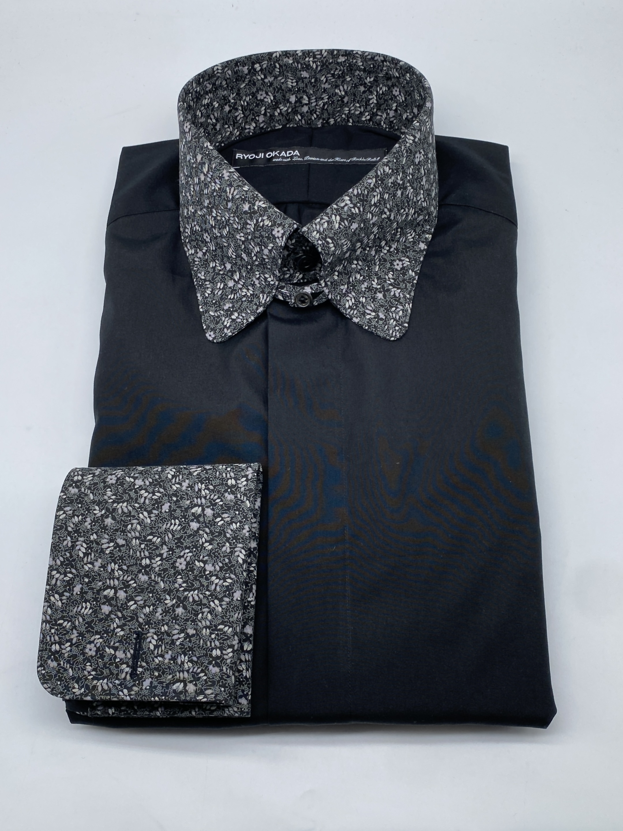 デザインは「ショートワイドスプレッドカラー + 大丸シングルボタンカフス + フレンチフロント(裏前立)+ 胸ポケットレス仕様」です。