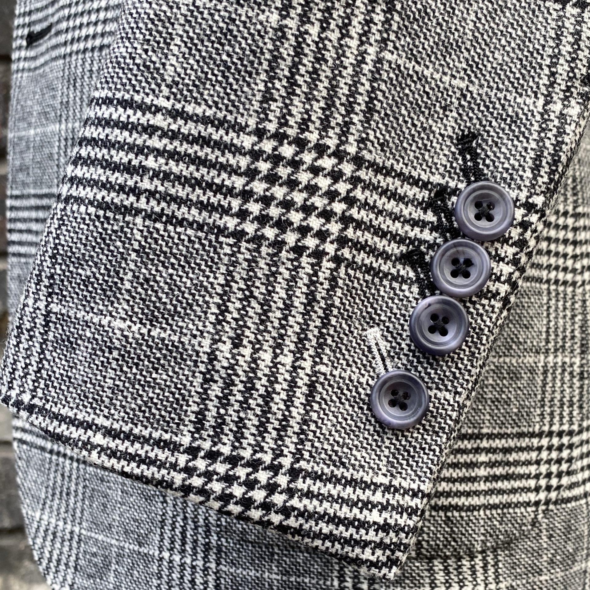 ボタンはmade in Englandのニューカラー:Greyリアルホーン(本水牛)ボタン、ライニングはGreyのハウンズトゥースジャカードです。