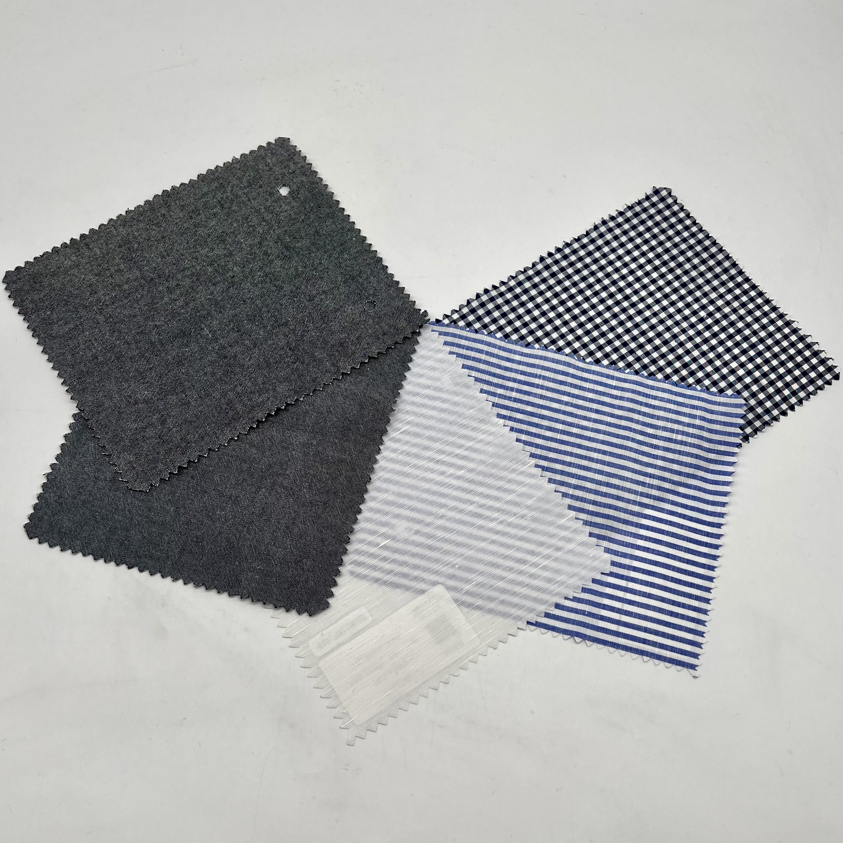 FM12910(右下):WhiteベースにBlackのピンストライプです。Shirting(シャーティング:シャツ向けテキスタイル)業界ではこのタイプのダークカラーをBlackと表現することが多いのですが「実際にはDark Grayかな?」とも思います。いずれにしても極めてシャープでクールなストライプではないでしょうか?Black(あるいはDark Gray)のピンストライプはなかなかレアですので気になる方はぜひともお早めにお願いします。