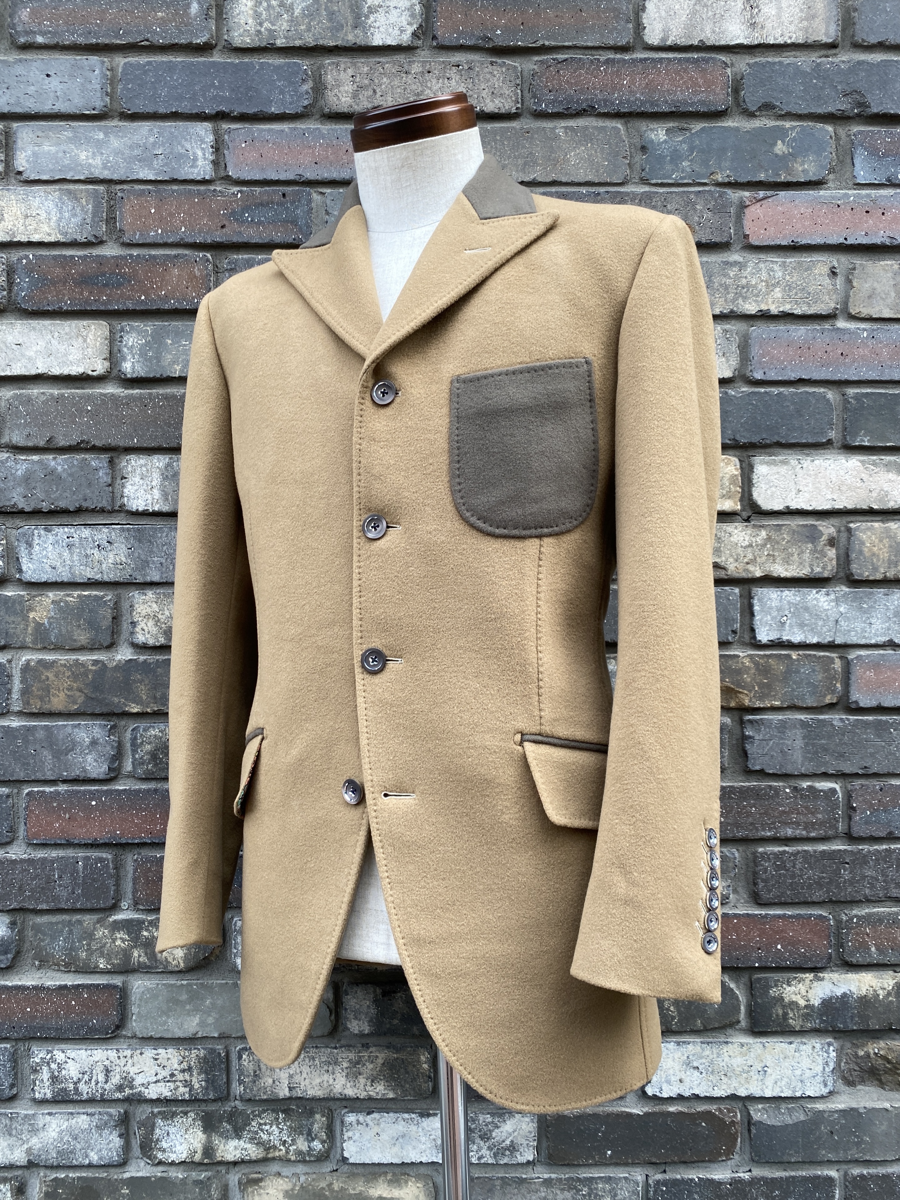 デザインは「9.0cm巾&ハイゴージーラインのピークトラペル + シングルブレステッド4ボタン + ナチュラルショルダー + アウト/パッチ仕様のチェストポケット + 前後差5.0cmの急アングルハッキング/スランテッドウエストポケット + セミカッタウェイフロント + センターヴェント」です。