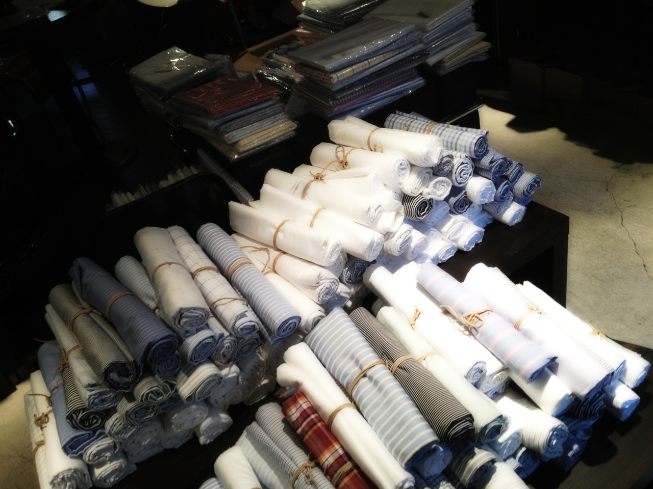 手前側の紐で結ばれている着分がドメスティックファブリック、2枚で¥13,650〜。