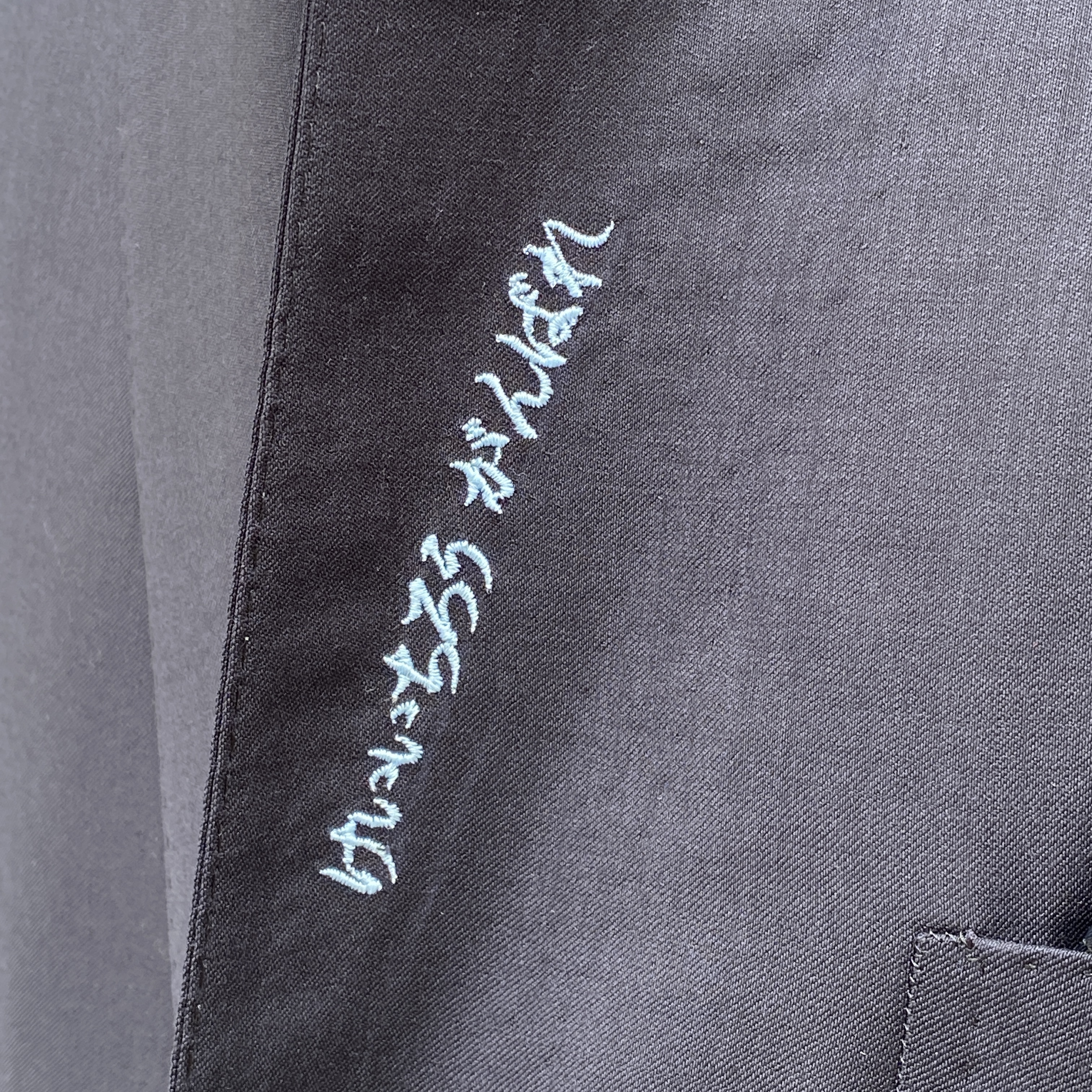 今日はとってもナイスな日本語刺繍が左右のラペル裏に入ったスーツとそのスーツに合わせるようにご注文いただいたシャツをご紹介します。