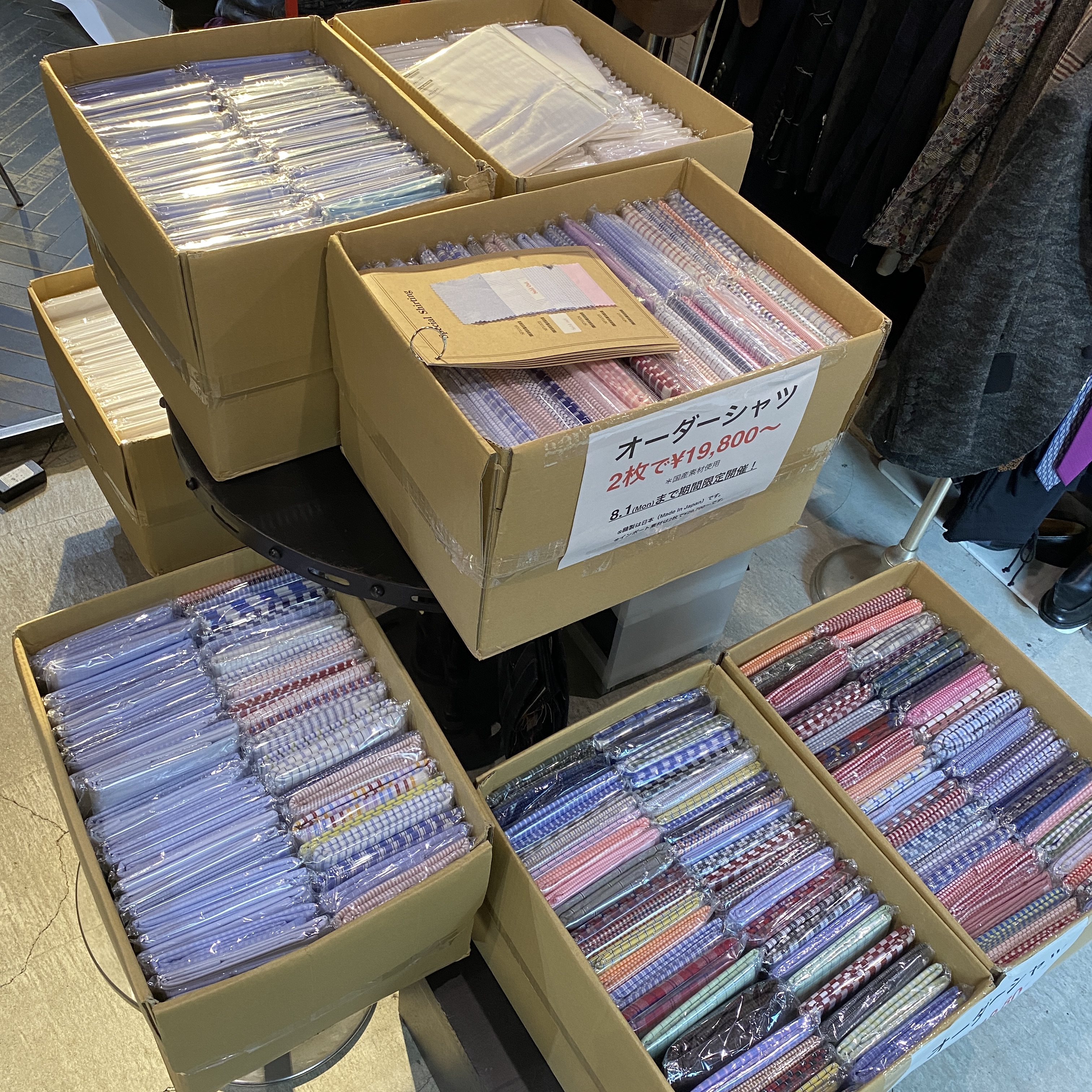 7.9 Satから本開催スタート予定の「オーダーメイドシャツ×2枚=¥19,800~(税込価格)」キャンペーンですが、おととい無事にキャンペーン専用着分等々が店頭に到着しました!