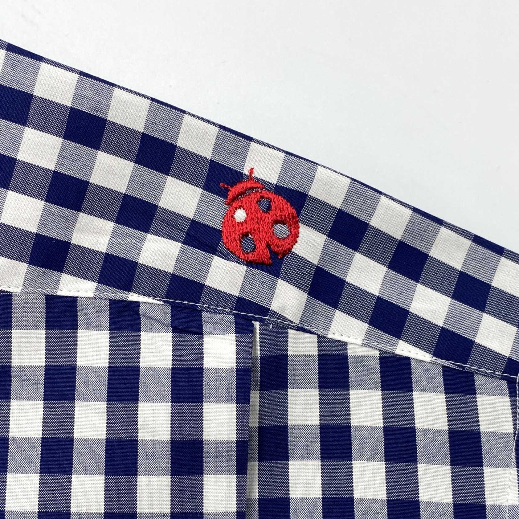 カラーとカフスの裏面に使ったNavy Blue×Whiteのドット素材もとってもナイスだし、Red糸で入れたてんとう虫刺繍が生み出すバックヨークのRed, White and Blueも最高にナイス!