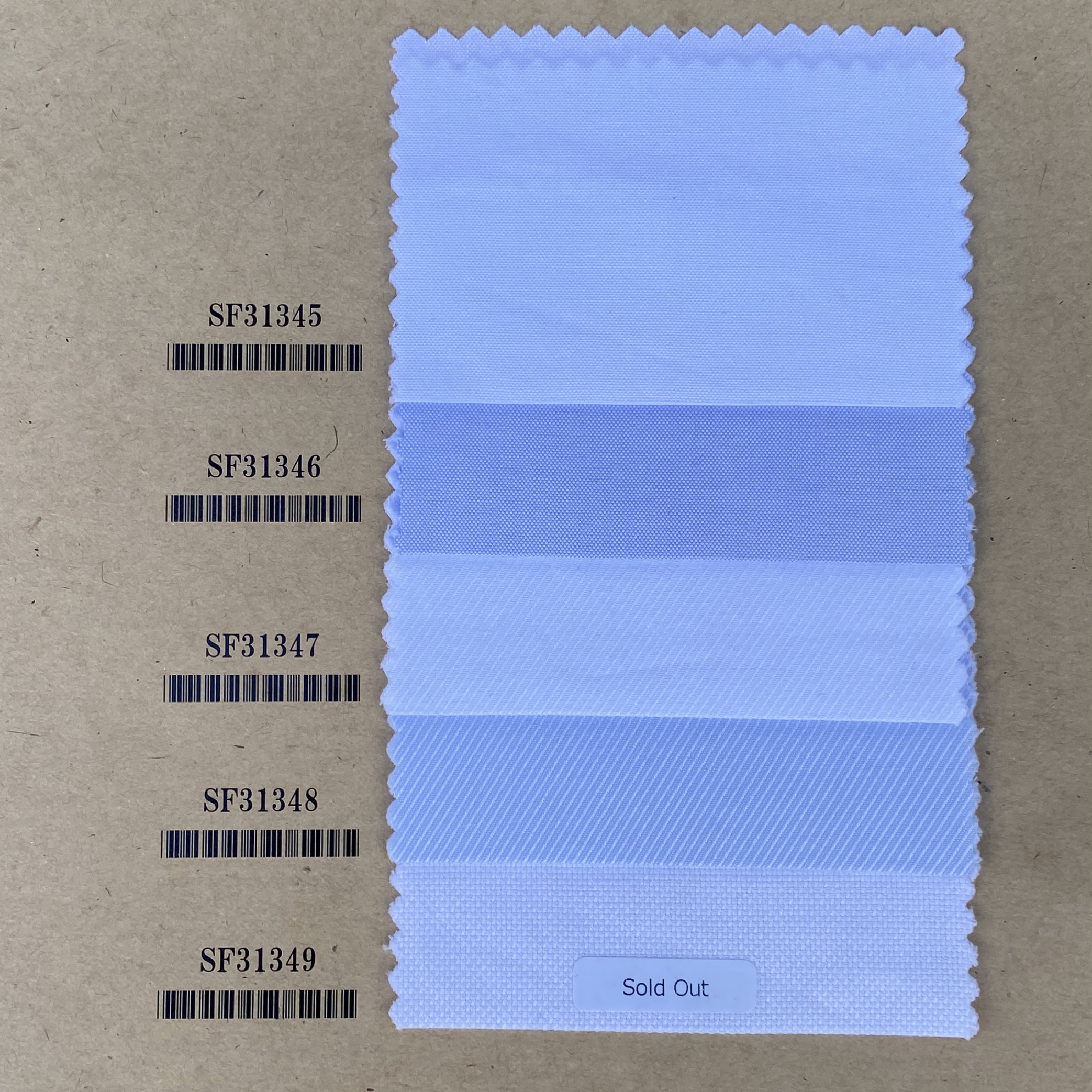 上2マーク:経糸(タテイト)・緯糸(ヨコイト)ともに100番手双糸(ソウシ)のポプリン/ブロード(平織)です。上がWhiteで下がLight blueです。よき意味で「何の変哲もない上質なShirting(シャーティング:シャツ向けテキスタイル)」です。White無地はフォーマル用のシャツにもバッチリ使える「定番オブ定番」な素材です!