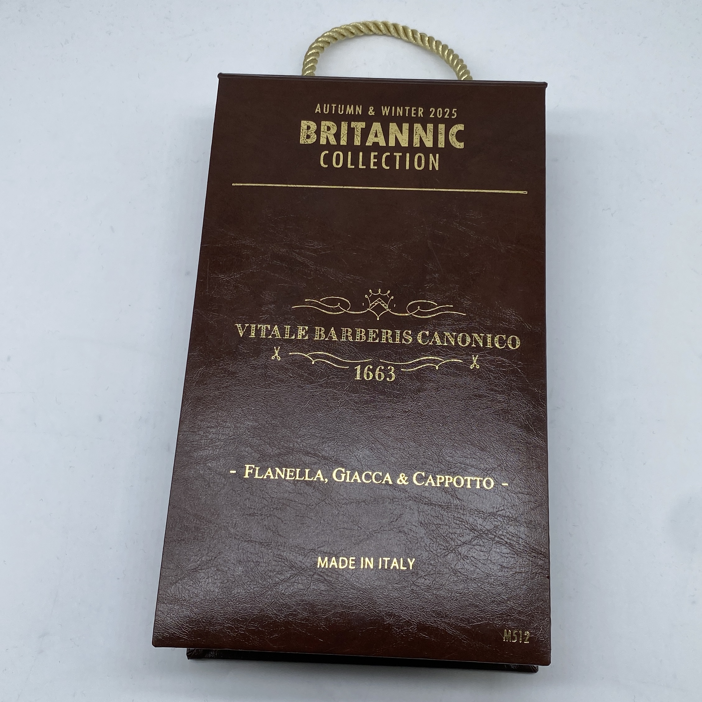 上3マーク:「Saxon Merino Wool原料を100%使用したThe Saxon Clubシリーズ」のメルトン:Saxon Meltonです。Saxon Merino Woolはその卓越した品質で現代における高級Wool原料の主流となっているAustrian Merino Woolの祖先で、その歴史は18世紀の欧州王室に由来します。Saxon種の羊は比較的小型で牧羊業者らの交配と選別作業の賜物として生まれました。彼らの体躯には多くの皺があり被毛はかなり密に生えています。繊維は細く、そのクリンプはまるで強力なバネのようで、これが大きなボリュームと構造的特徴を生んでいます。VBCはそんなSaxon Merino Woolの素晴らしさに再注目し2024年にThe Saxon Clubを始動、2025-2026 Autumn/WinterシーズンはこちらのSaxon Meltonをリリースしました。品質は100% Wool(560g/m)です。上質かつ力強いSaxon Merino Wool原料を100%使用したモダンレトロなメルトン:Saxon Meltonはエレガントながらもガンガン使えるコートに最適な強い打ち込みと滑らかな表面感を併せ持つ逸品です。書くまでもなく確かな保温性と高い耐久性を兼ね備えてもいます。シックなトーンのカラーも魅力ですよね。1番下はダークなNavy Blueです。