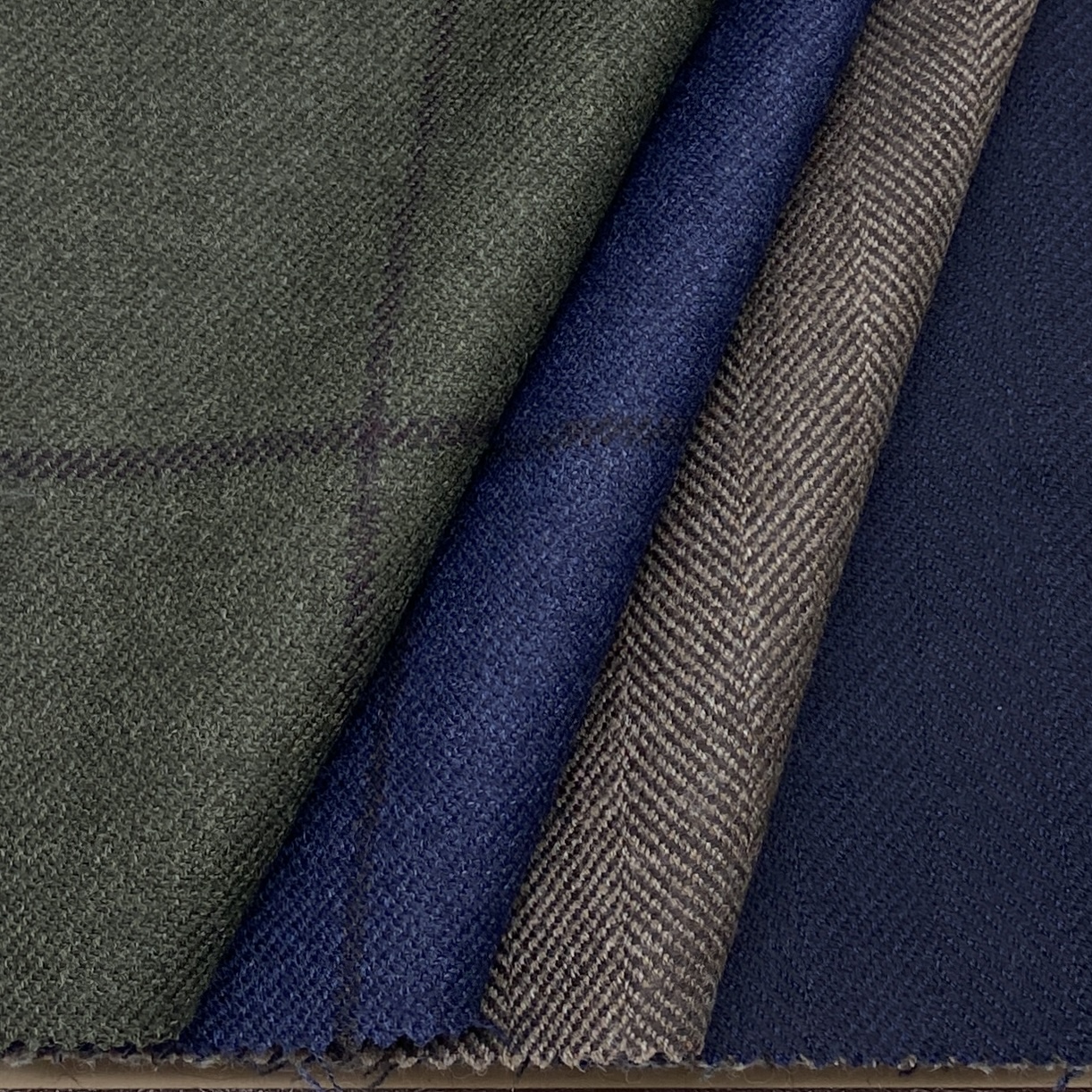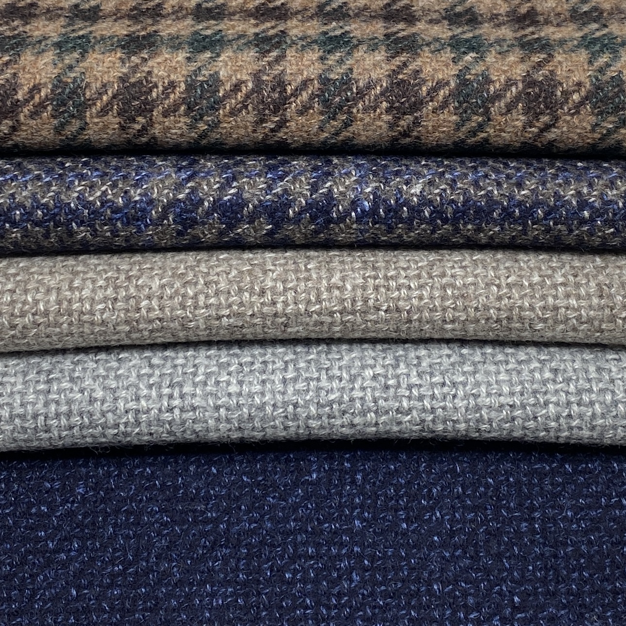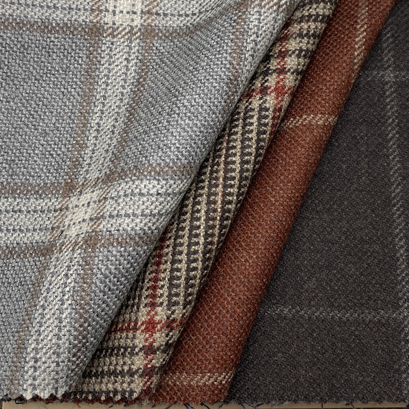 「我々が微起毛などとも呼ぶわずかにミルド(起毛)加工を施した温かみのある表面」「気品のあるカラーリングで表現されたクラシックパターン」「Woollen Suitingならではの芯を感じる頼もしい素材感」が三位一体となった傑作です。