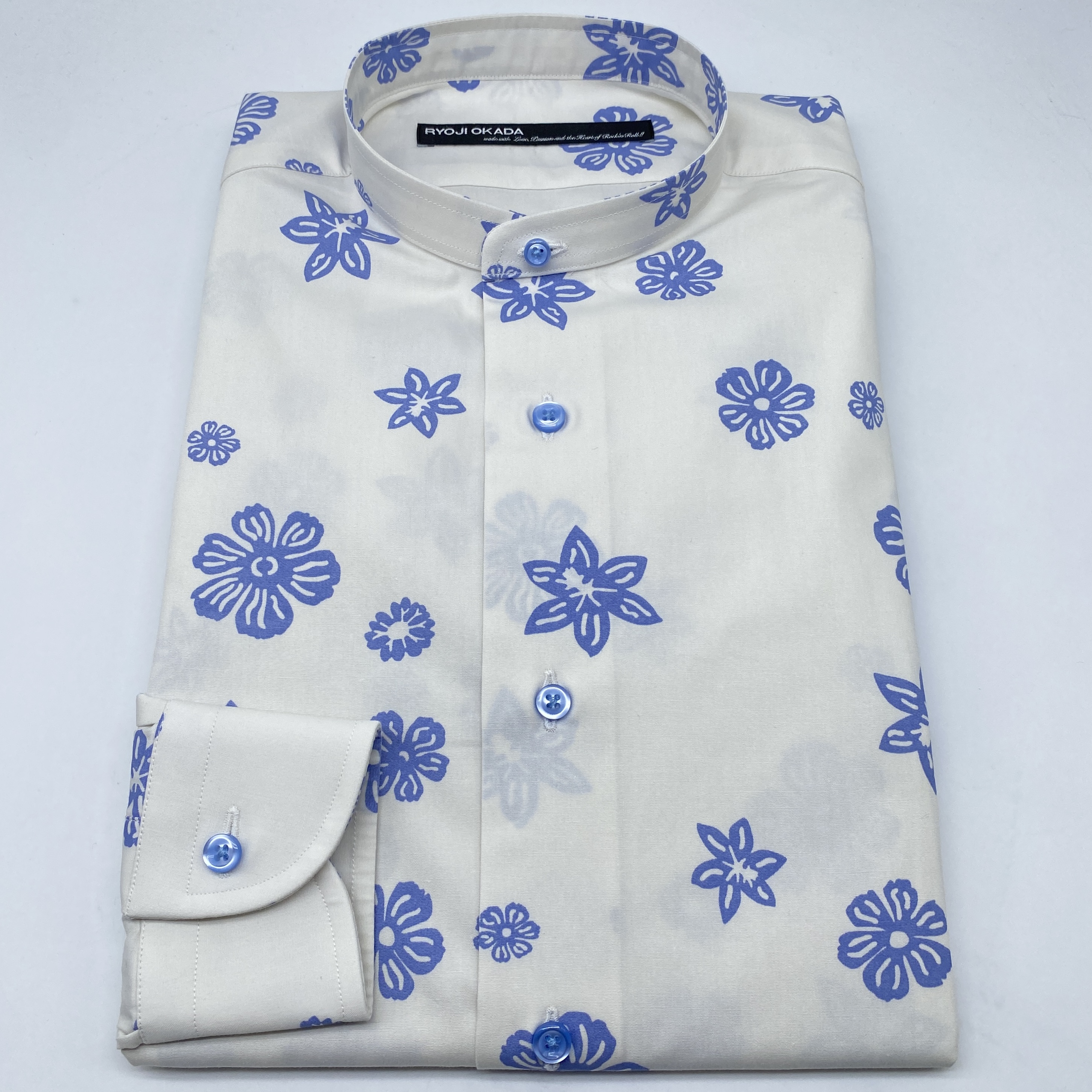美しくも知的なBlueと柔和なOff Whiteのナイスカラーコンビネーション、少し「和」も感じさせるアーティスティックなフローラルプリント、強めの打ち込みに由来する少々ハードなタッチが三位一体となった逸品です。