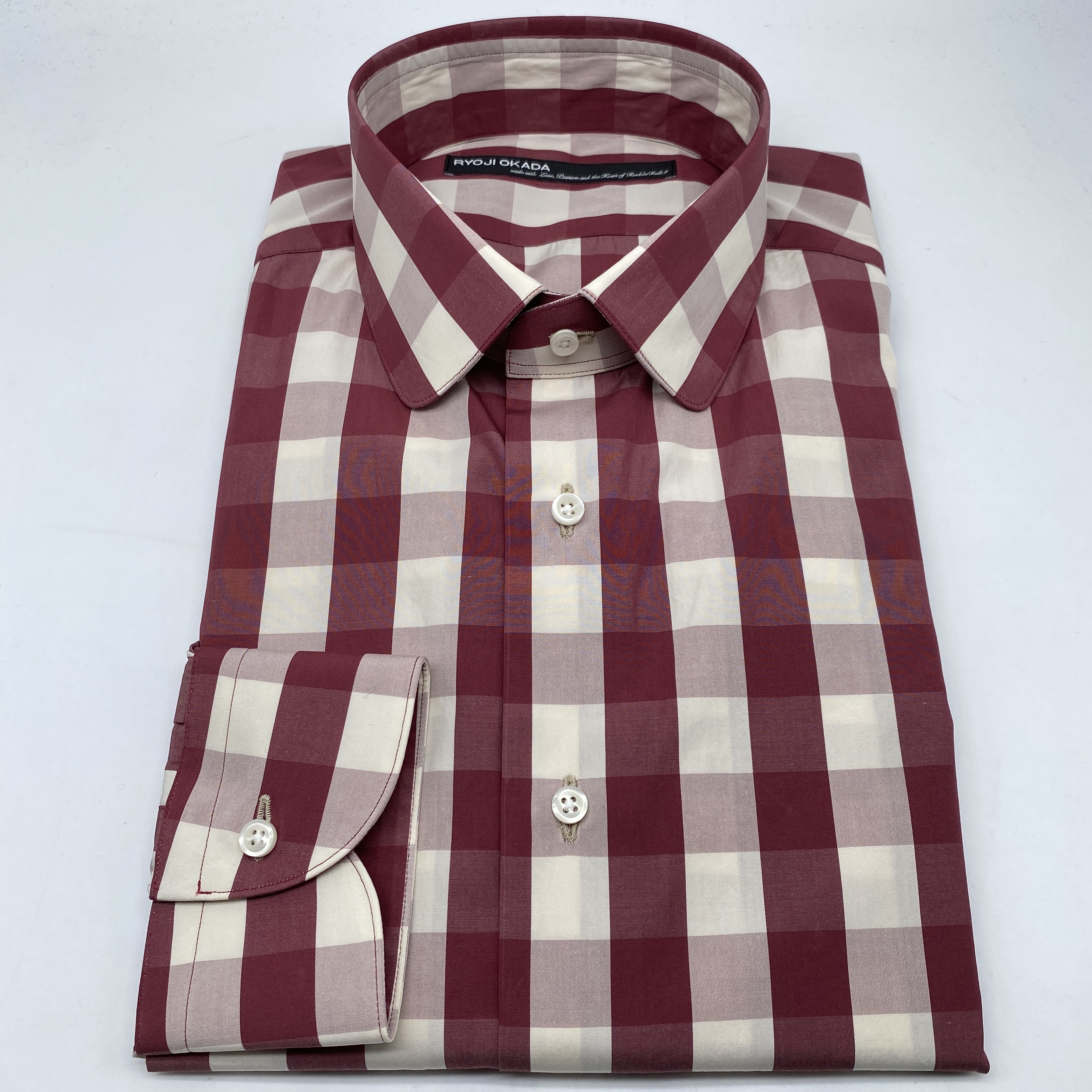 具体的には「ギャザースタイル + ラージラウンドカッタウェイカラー + 8.0㎝巾の大丸シングルボタンカフス + フライフロント(比翼仕立)+ 胸ポケットレス仕様」といったスタイル/デザインです。