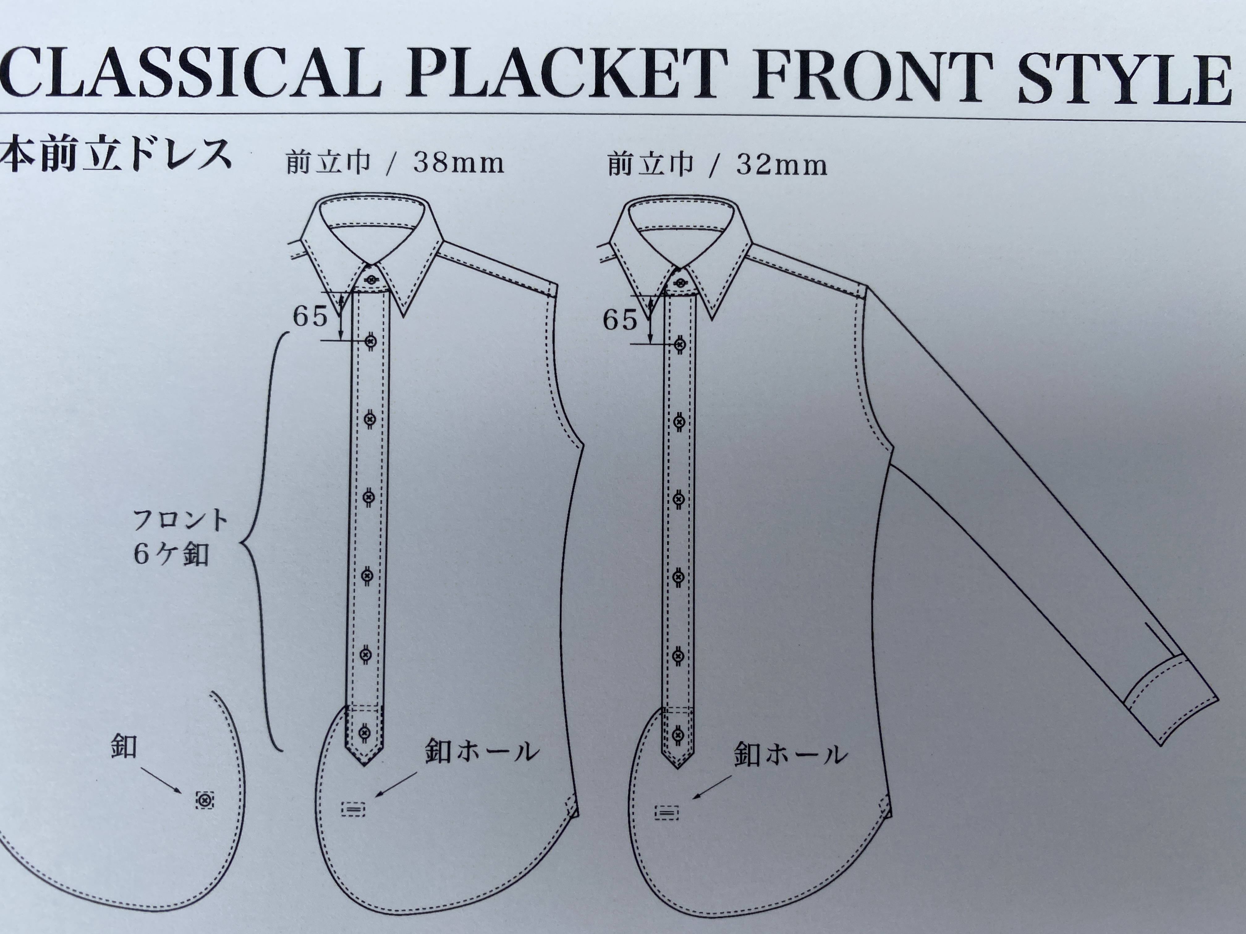 – 上画像 <本前立ドレススタイル> :(台衿ボタンを除いた)前立ボタン7個(着丈ノーマル/裾をタックインしての着用想定フロント)・前立巾は38mmと32mmをご用意