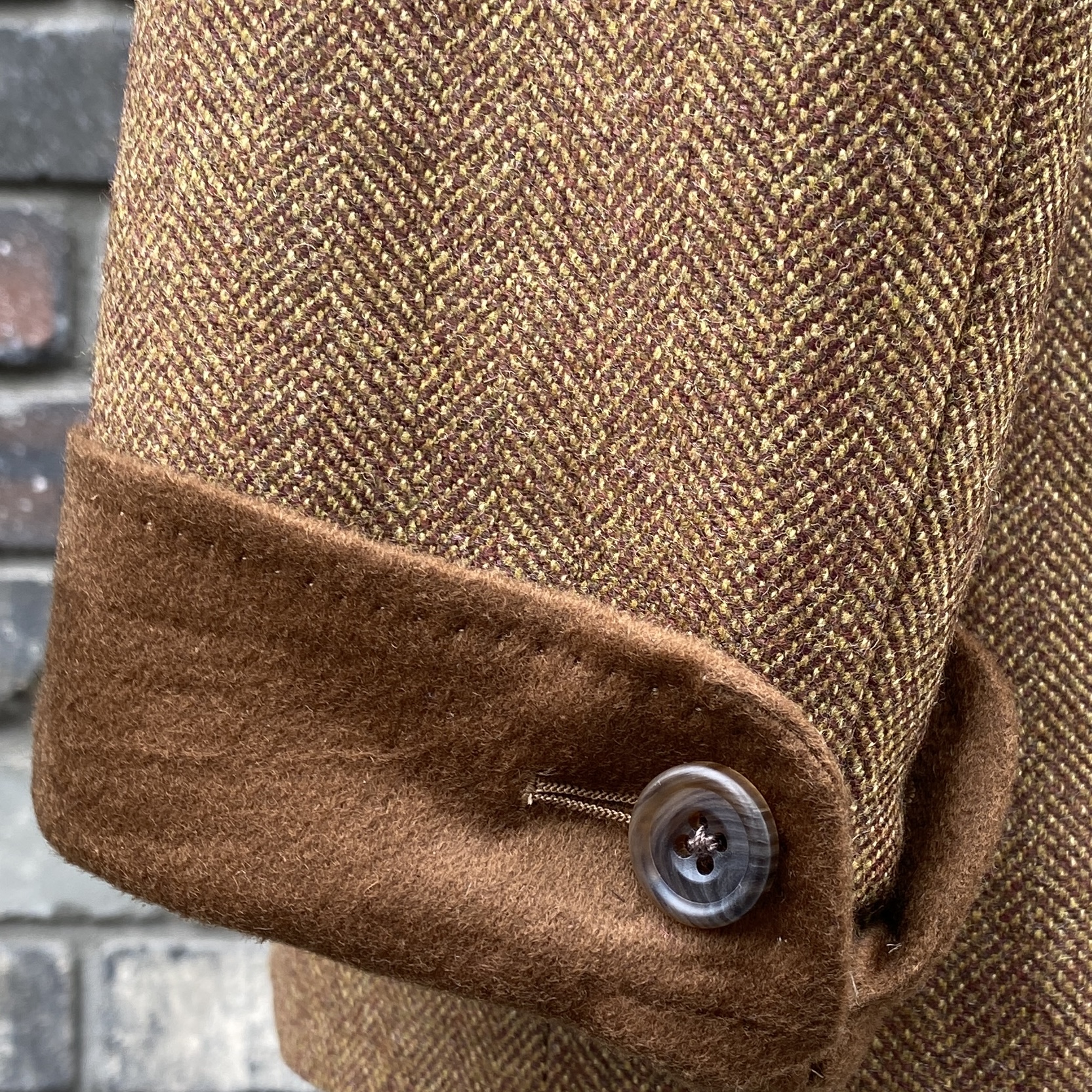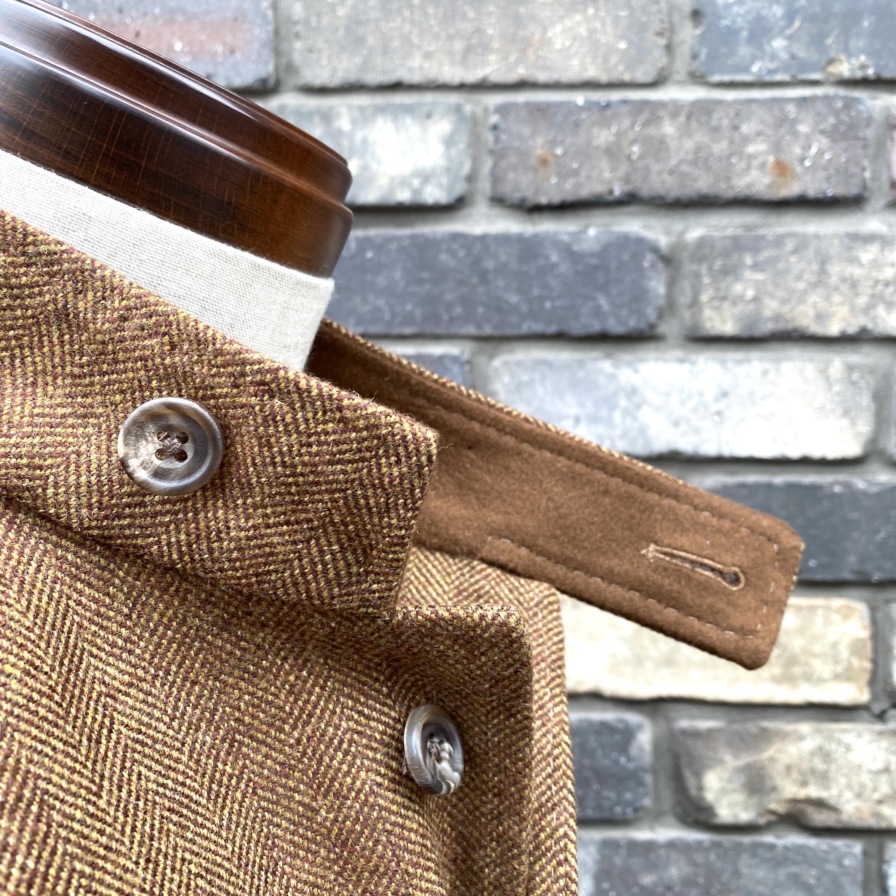 「Brown無地の100% Cashmereを使用したやや短め巾のターンバックカフス」と「フロントボタンと同じ大きさ:20mm&Mottled Dark Brown&Made in Englandのリアルホーン(本水牛)ボタン 2個仕様(内面もボタン仕様になっています)」が特徴です。