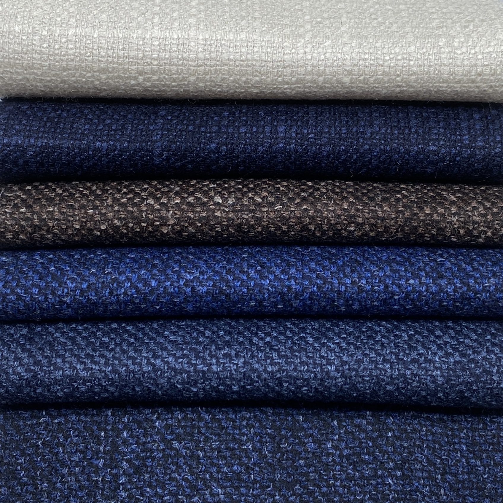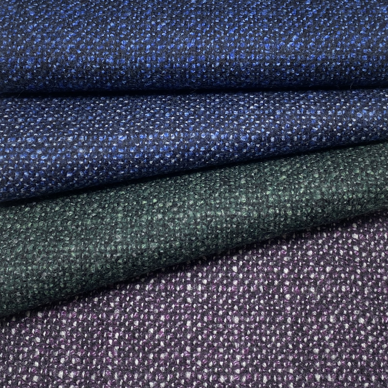 ①:Wool & Silk & Linenの「3者混」Jacketingです。品質は76% Wool + 14% Silk + 10% Linen(280/290g/m)です。「上質なWoolに由来するCashmereライクな滑らかさとしなやかさ」「極上のSilkに由来する美しい光沢とランダムな節が生む高級感と独特の立体感」「Linenに由来するさりげない野趣味」が見事なまでに三位一体となった美しい素材です。ご覧の通りカラーリングのキレイさも白眉だと思います。2マークだけなのが惜しいボディですね!以前にもこのDiaryで書きましたが、ここ数年Spring/Summer向けの原料というイメージが強いLinenをAutum/Winter向けのボディにブレンドするケースが増えてきました。Winter Linenという名前を冠するShirtingがスマッシュヒットを記録したのも記憶に新しいです。テキスタイルも多様性の時代ですね!そして、Linenならではの風合いは他の原料では表現が難しいのでこの傾向には僕も大賛成です!こちらの2マークもわずかにブレンドしたLinenがとっても「効いている」と思います。