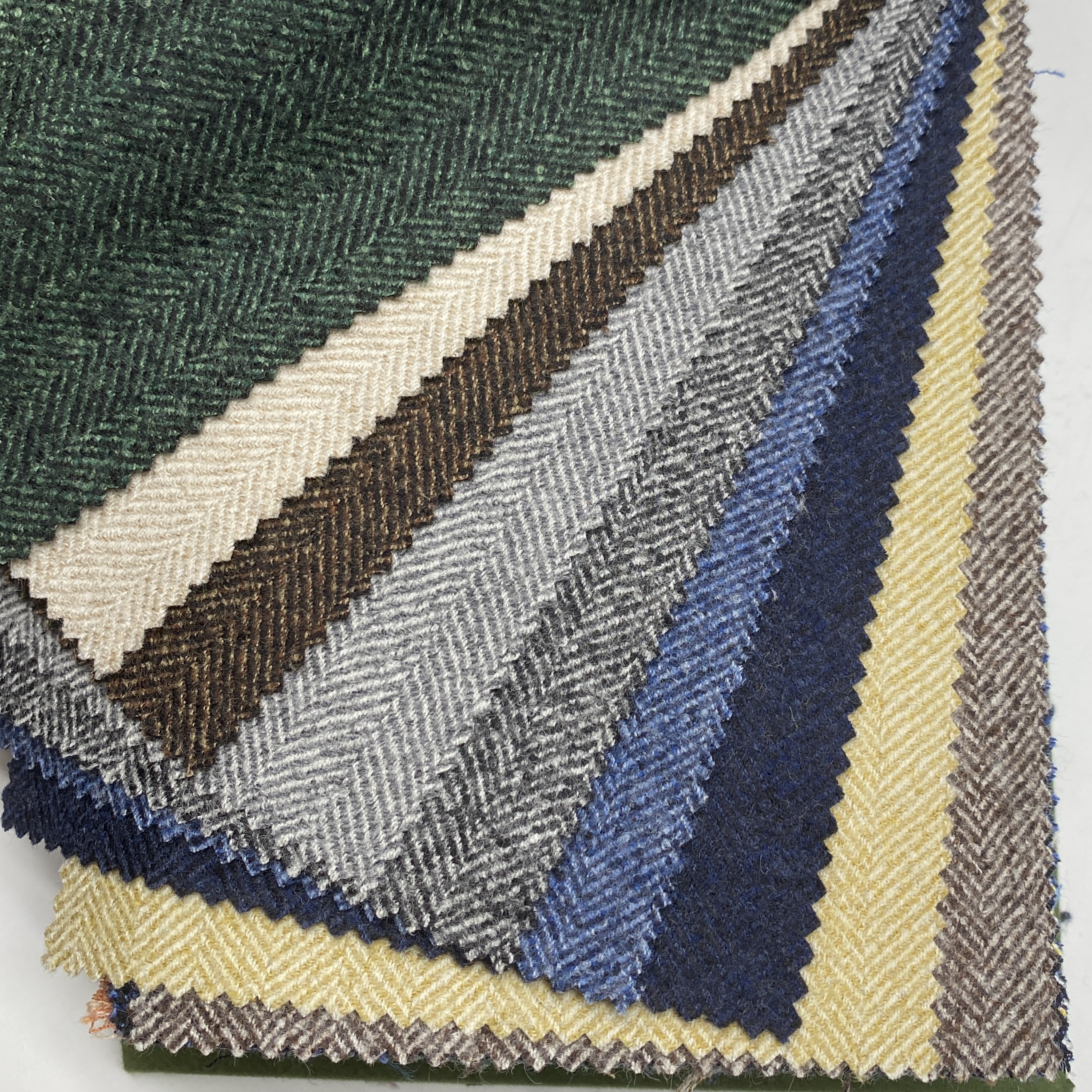 ②③:丁寧かつ繊細なミルド加工が絶妙過ぎるFlannelタイプのJacketingです。品質は100% Wool(340/350g/m)です。Napoli Jacketの定番ボディですね。定番ならではの安心感とご覧の洗練されたカラーリングが自慢です。チェック5マーク(②)も素晴らしいですが、ここ1年ほど「再浮上」しているヘリンボンが9マークもコンパイルされているのが嬉しい限りです!