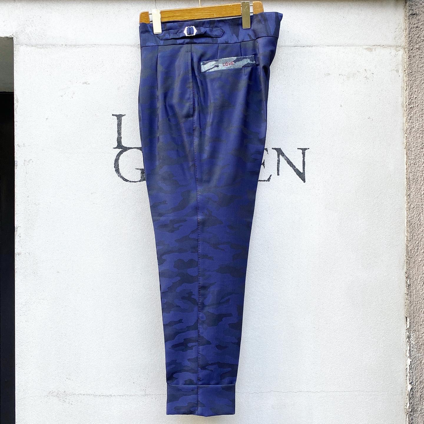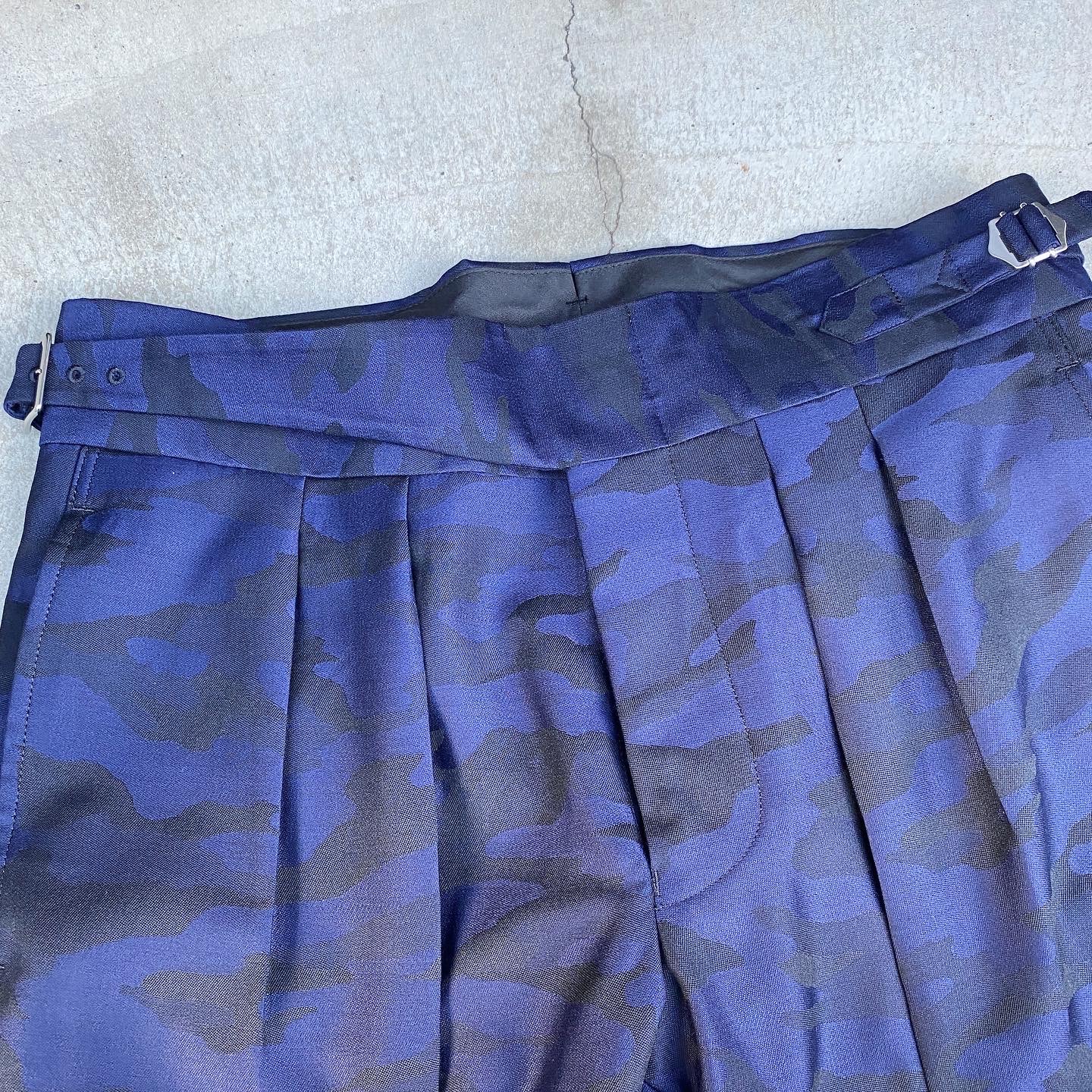 鮮やかなブルーが印象深い「イタリアンミルBiellesiによるカモフラージュジャカード素材」で作ったグルカパンツ仕様の1本です。