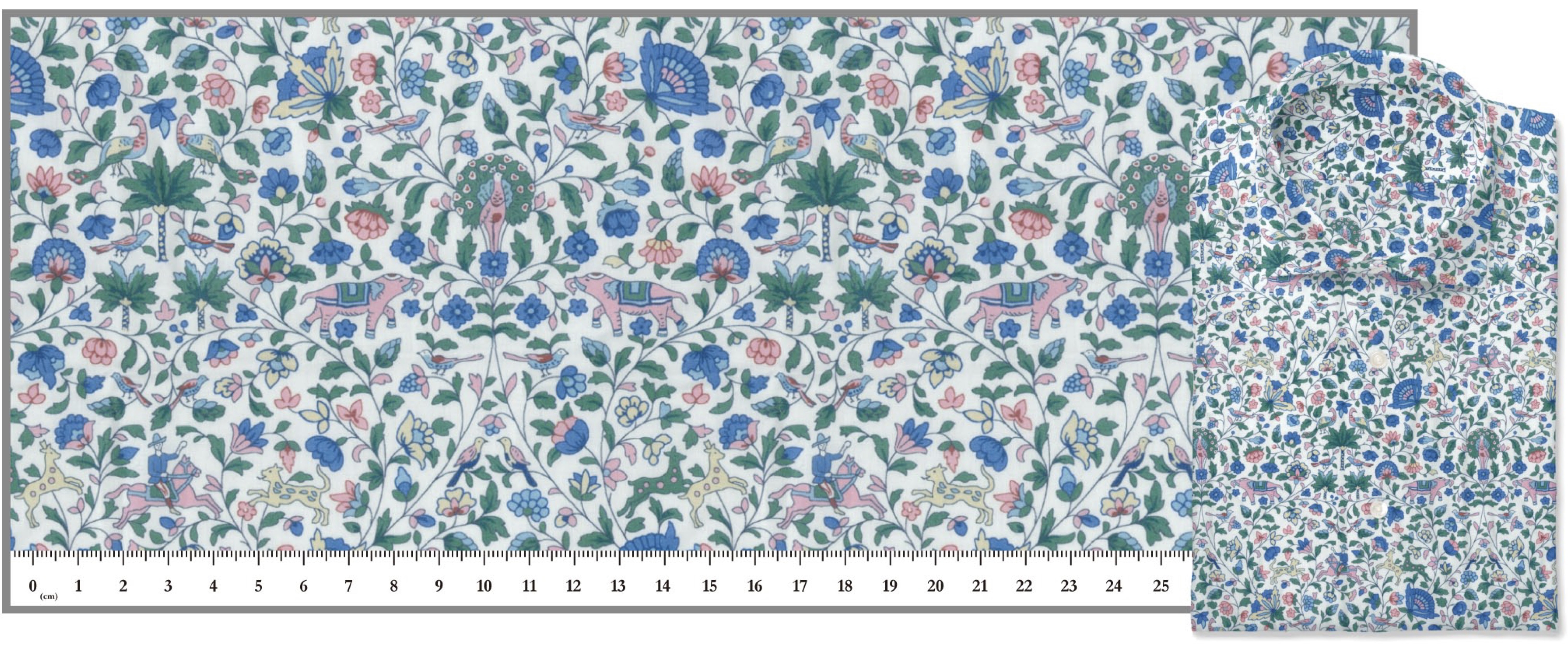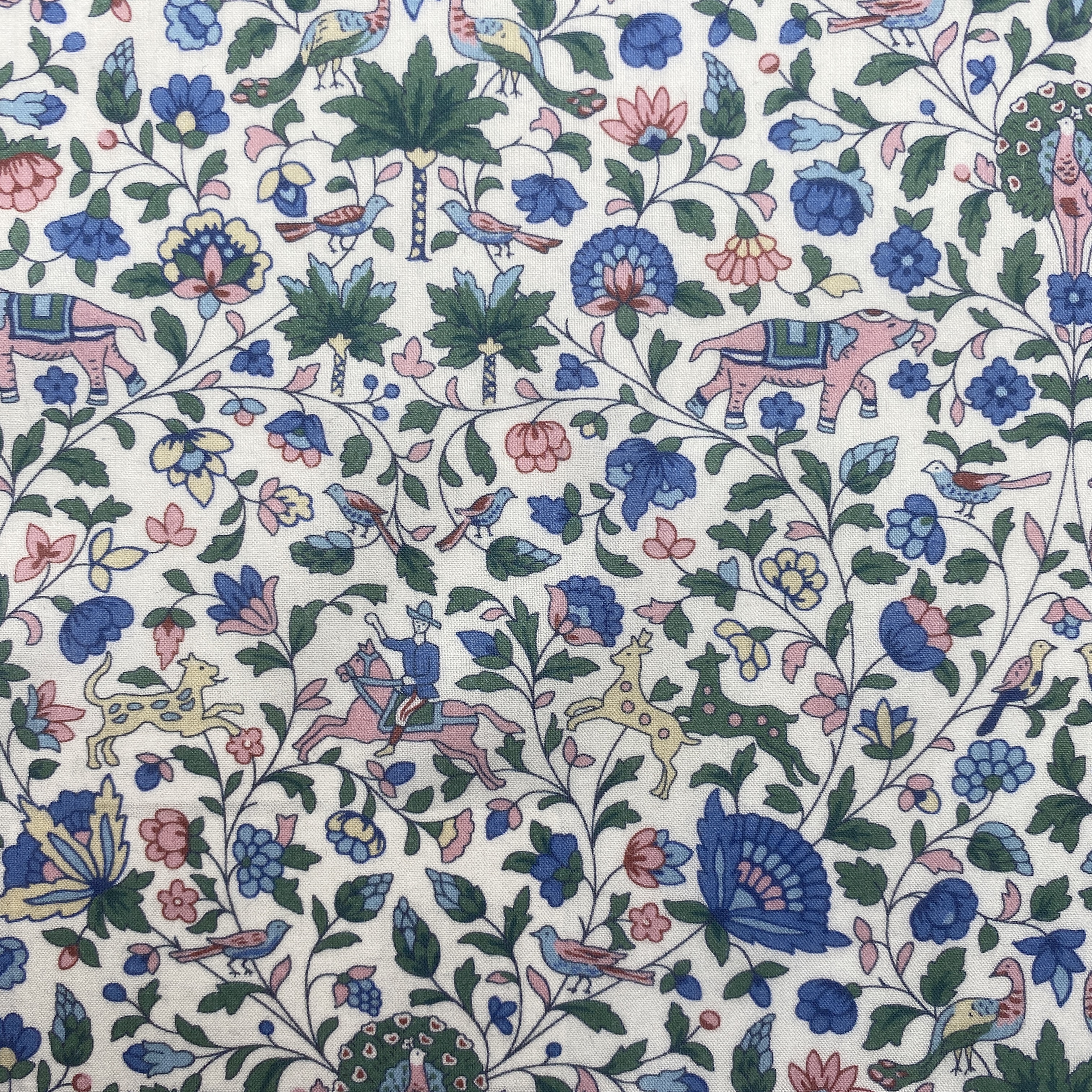 花、葉、木、鳥、孔雀、象、そして騎手が織り成す小さな世界を楽しげに表現したオリエンタルタッチのカンヴァセーションデザインがとても印象的ないかにもLibertyらしい傑作です。