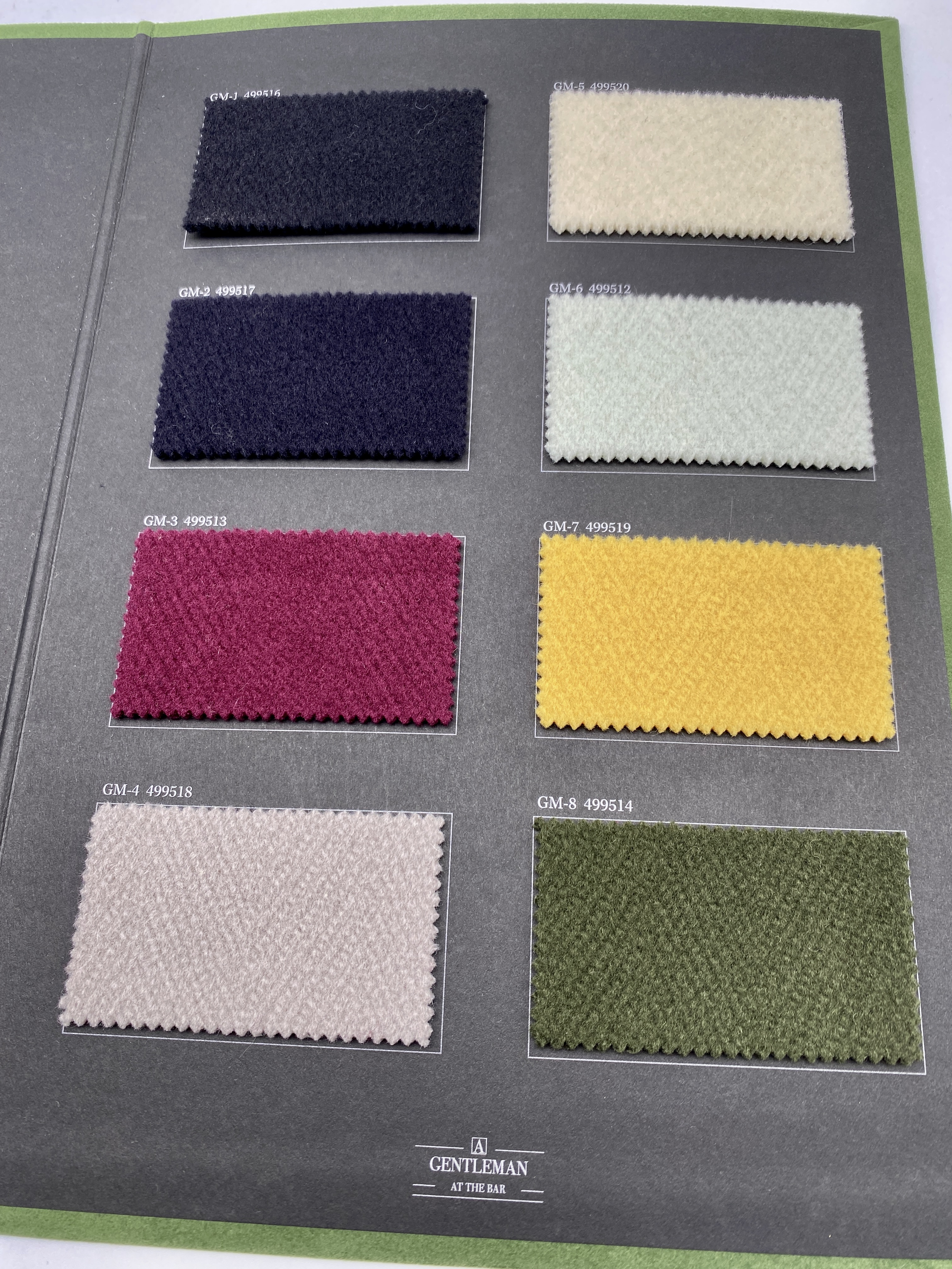 品質は100% Wool(800g/m)で、A Gentleman At The Bar用にBlack/Navy Blue/Bordeaux/Mink/Milk/Mint Green/Yellow/Forest Greenの8カラーが提供されました。