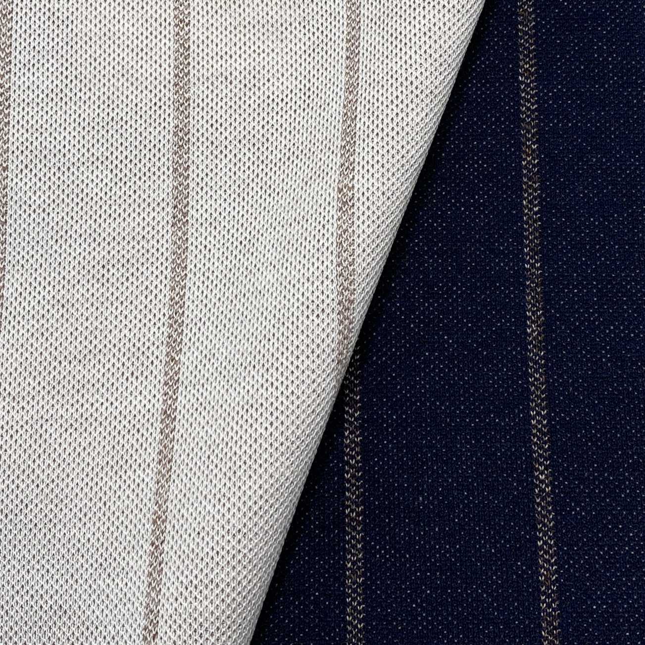 それはともかく、Cool Effectであることに加えて、端正なNavy BlueにBlackという珍しいカラーリングのストライプが最高にスタイリッシュな素材ではないでしょうか?