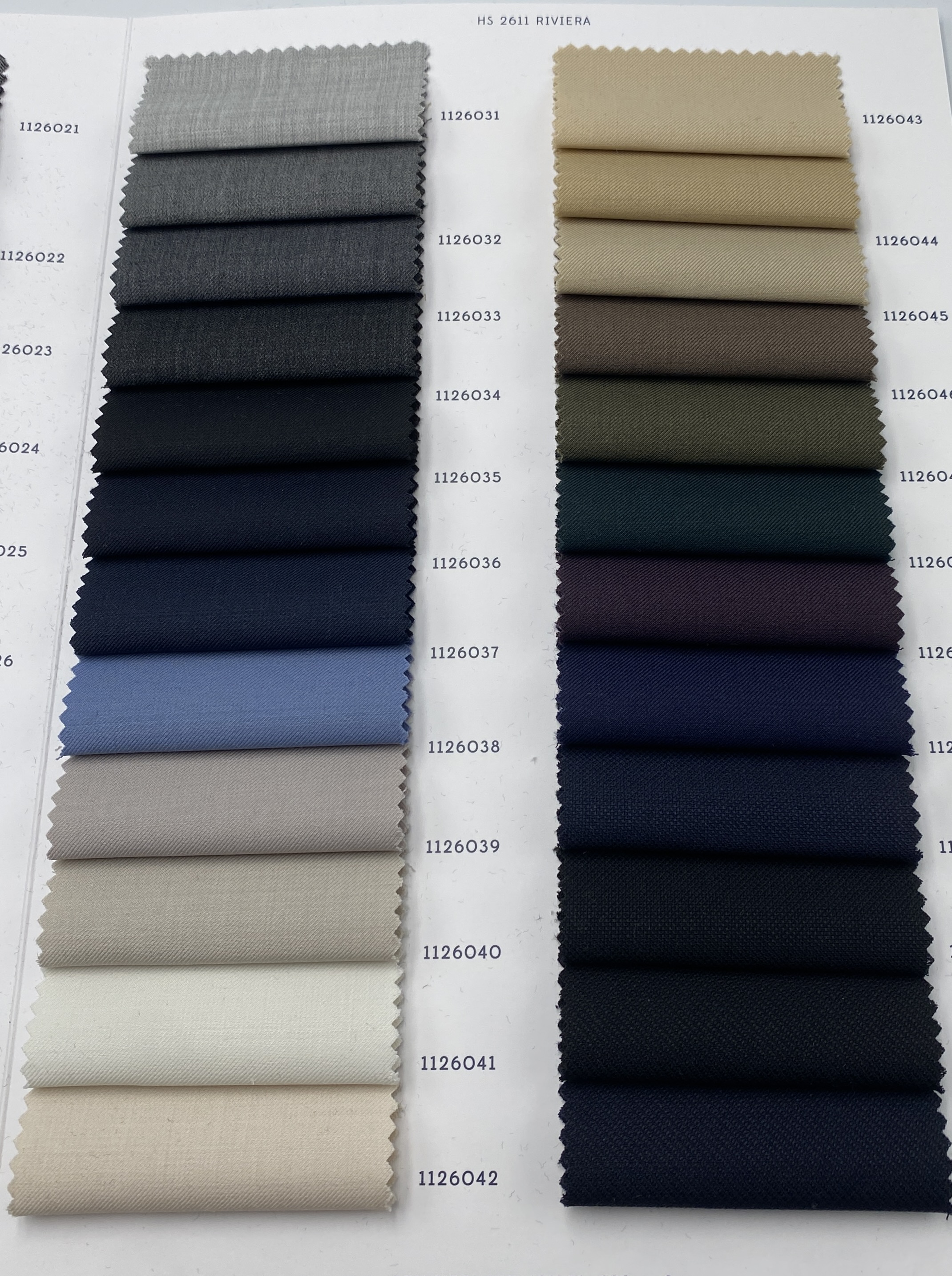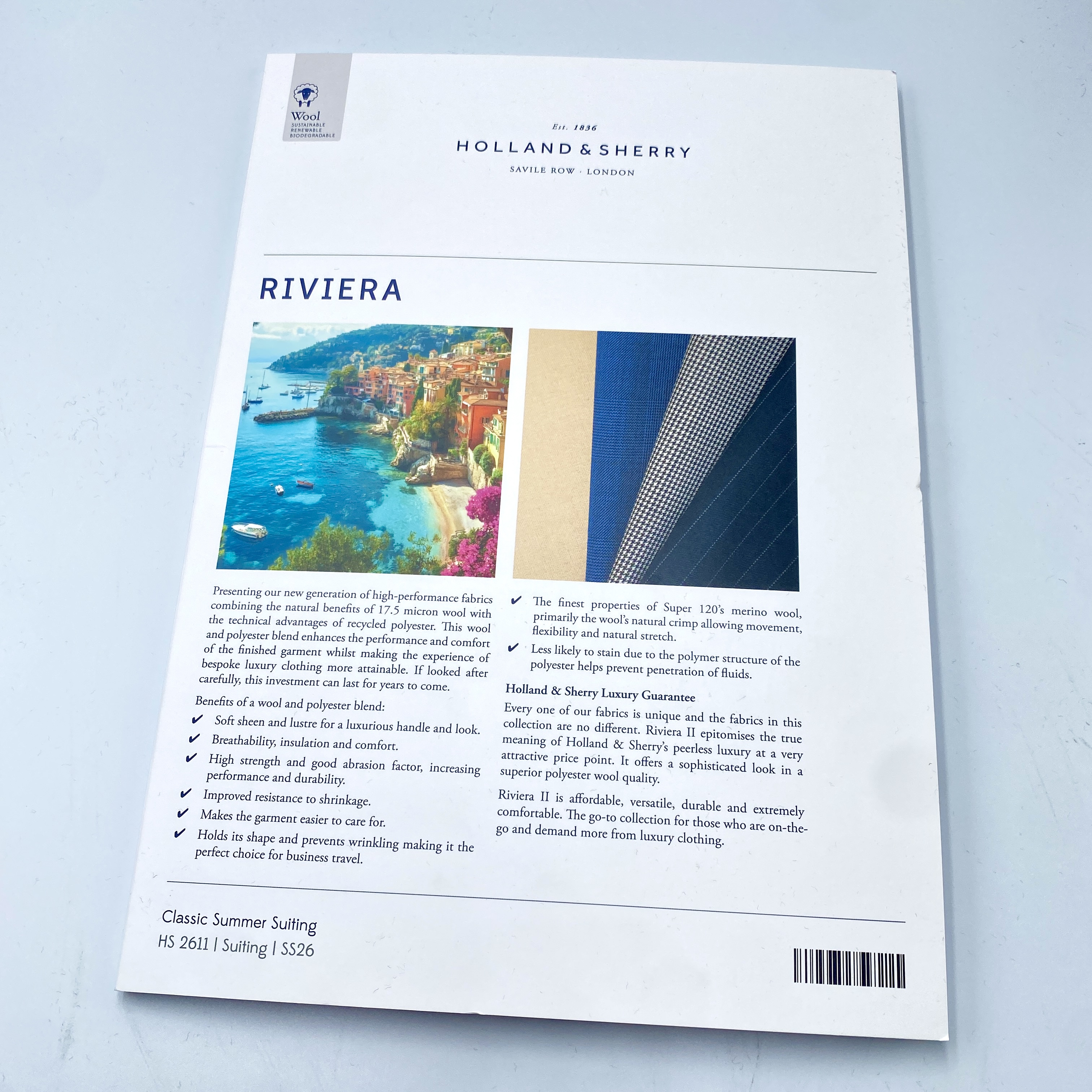 厳選された上質なMerino Woolと高度な技術で生み出されたPolyesterのブレンド糸で織り上げられた「天然繊維と化学繊維の利点」を兼ね備えたRivieraは、Holland & Sherryの言葉を借りればずばり「Classic Summer Suiting(スーティング:スーツ向けテキスタイル)」です。