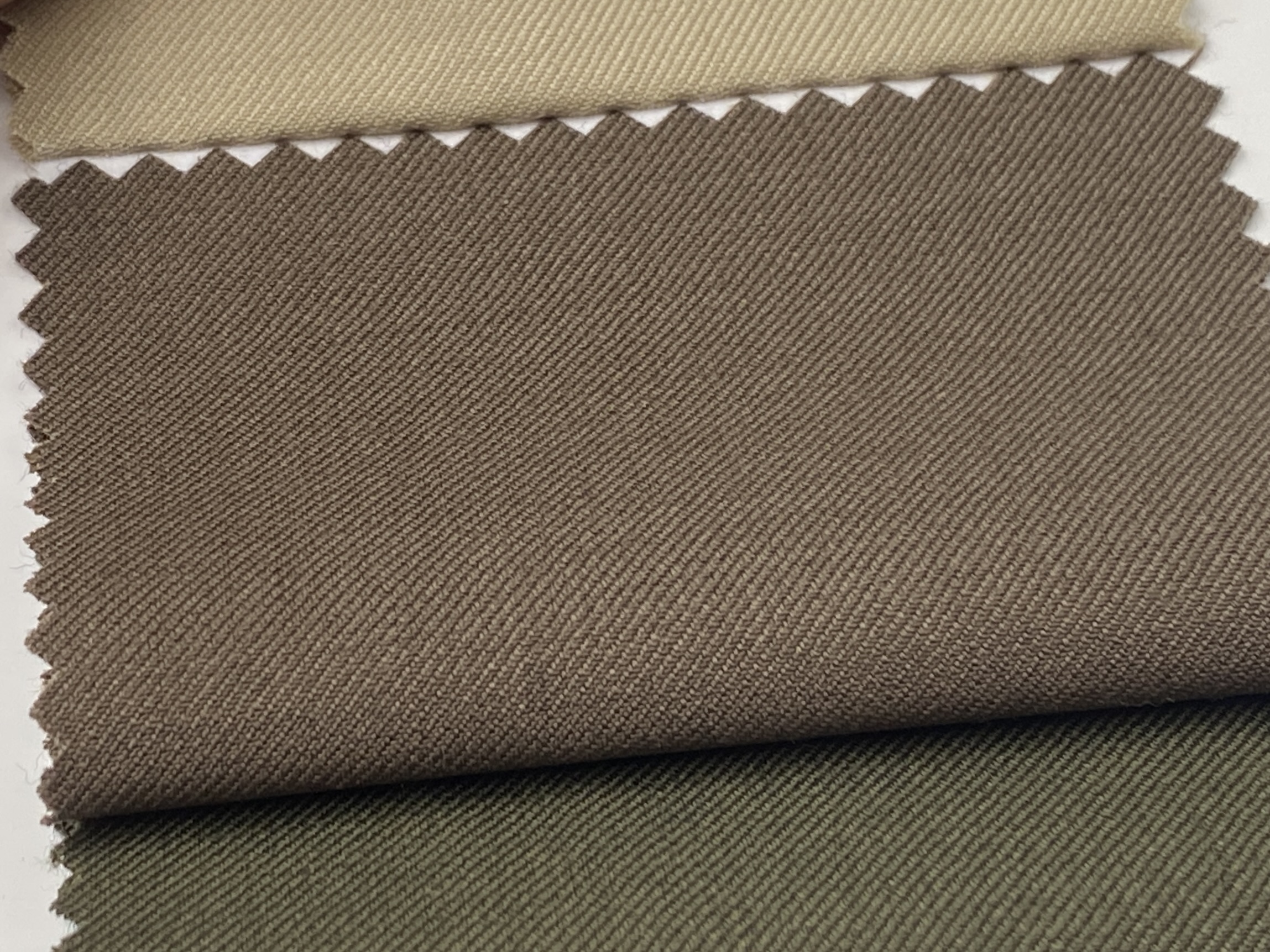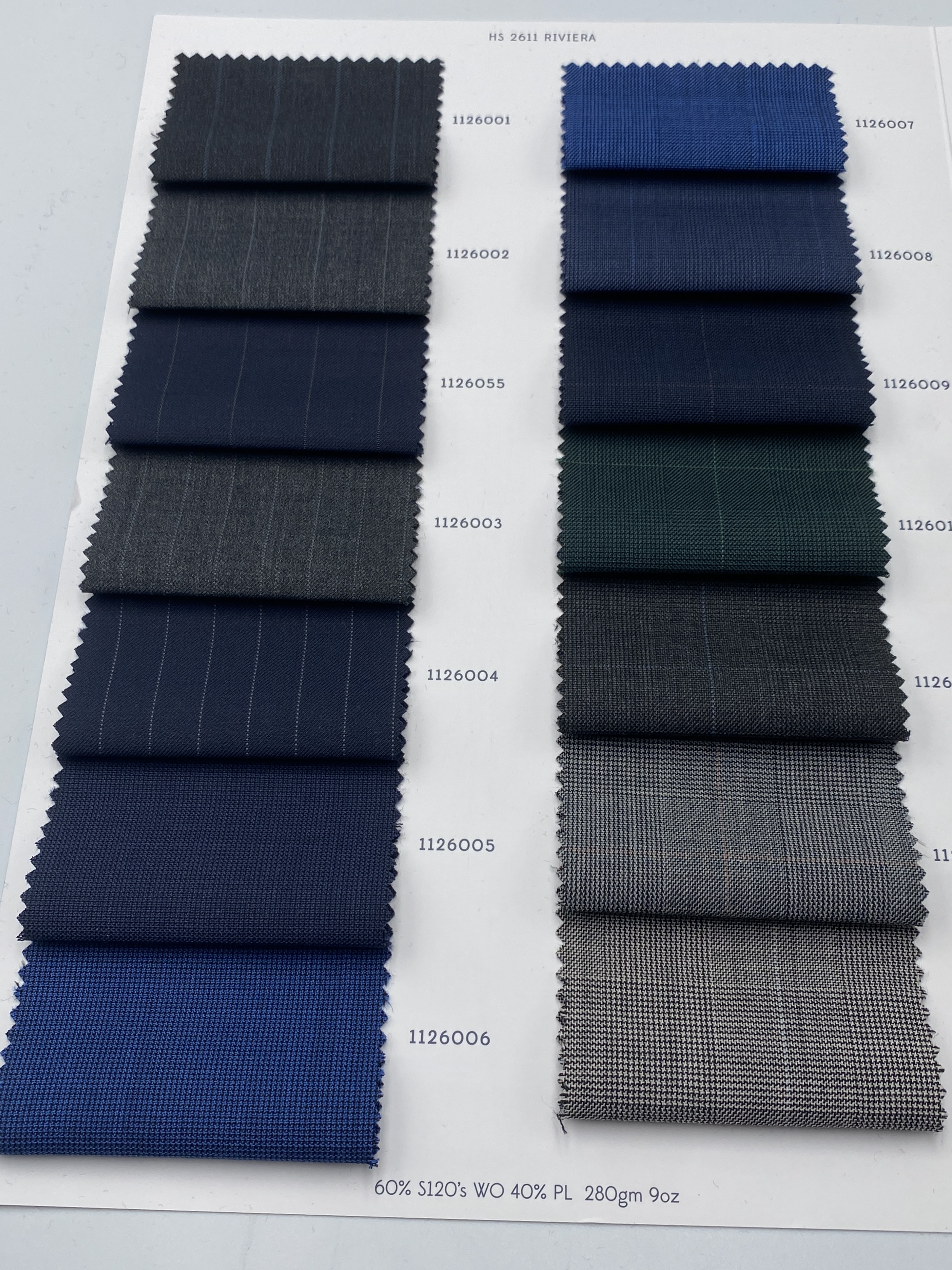 具体的な品質は60% Super 120’s Wool + 40% Polyester(280g/m)、組織はツイル(綾織)です。