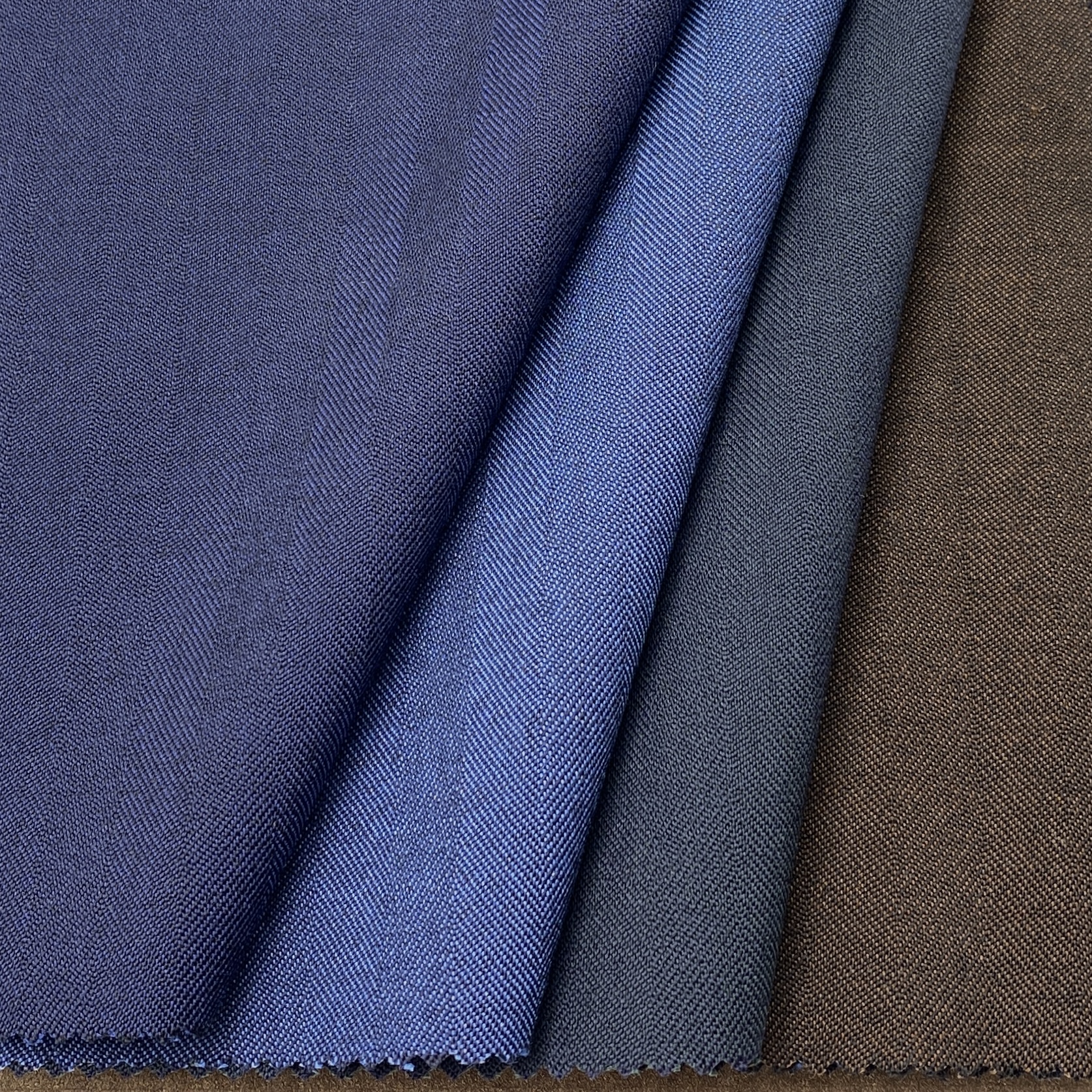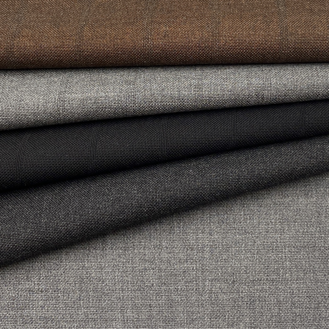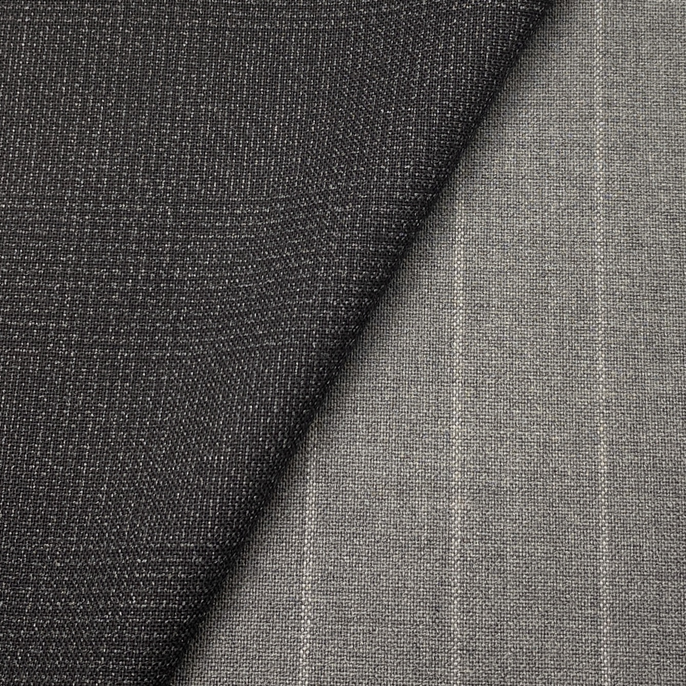 下画像:ぱっと見は無地に見えるシャドウストライプ3マークと完全な無地2マークです。これだけの素材ですから無地系/無地で作っておくというのも大いにアリですよね!