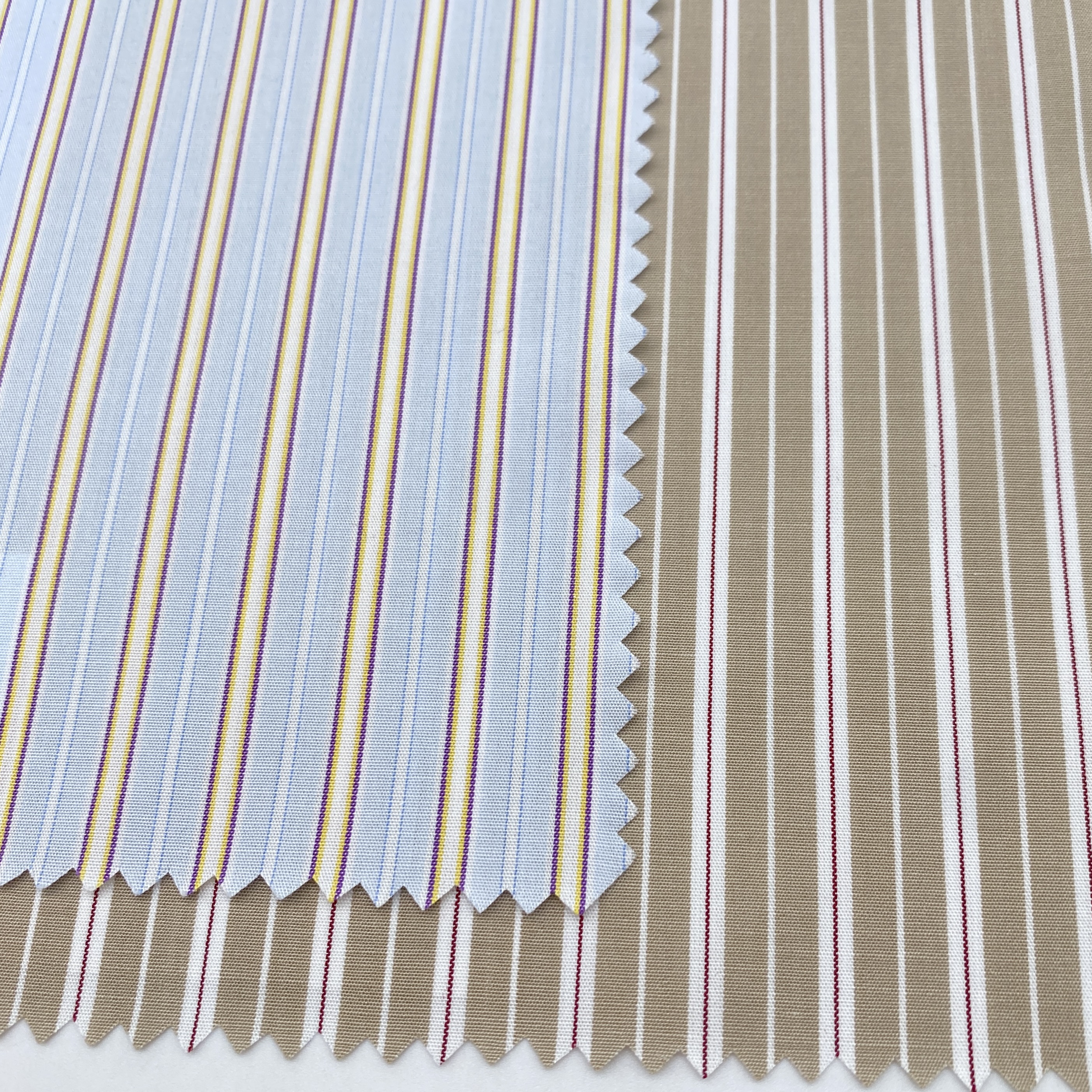 FM89725(右):Beigeのオルタネイトストライプです。こちらも「リヴァースストライプ」です。アーシーなベースカラーとラグジュアリーなWine Redのピンストライプ(とWhiteのストライプ)という少し意外性のあるカラーリングが白眉な素材です。僕はこちらなら「古(いにしえ)のワーカースタイル」で作りたいです。具体的には「ギャザースタイル + デタッチャブルカラー + コンヴァーチブル仕様の大丸シングルボタンカフス + クラシックプラケットフロント(本前立)+ 胸ポケットレス仕様 + Brownマザーオブパール(茶蝶貝)ボタン」で作りたいです。デタッチャブルカラーなのでカラーは最低でも2個作っておきたいですね。シャツと同素材およびWhite無地をともにラージラウンドカッタウェイカラーで作りたいです。それにプラスしてBeigeの無地あるいはBeigeあるいはBrown系のLibertyプリント素材でも作っておくとより楽しいもしれません!ギャザー仕様かつ古のスタイルなので少しゆったり目に作ってフワッと仕上げるのもアイディアかもしれません。とにもかくにも間違いなくOne of a kindな1枚が仕上がると思います。スーツスタイルにはもちろんカジュアルスタイルにも使いたいです。オーダーメイドシャツ(税込):¥20,900~