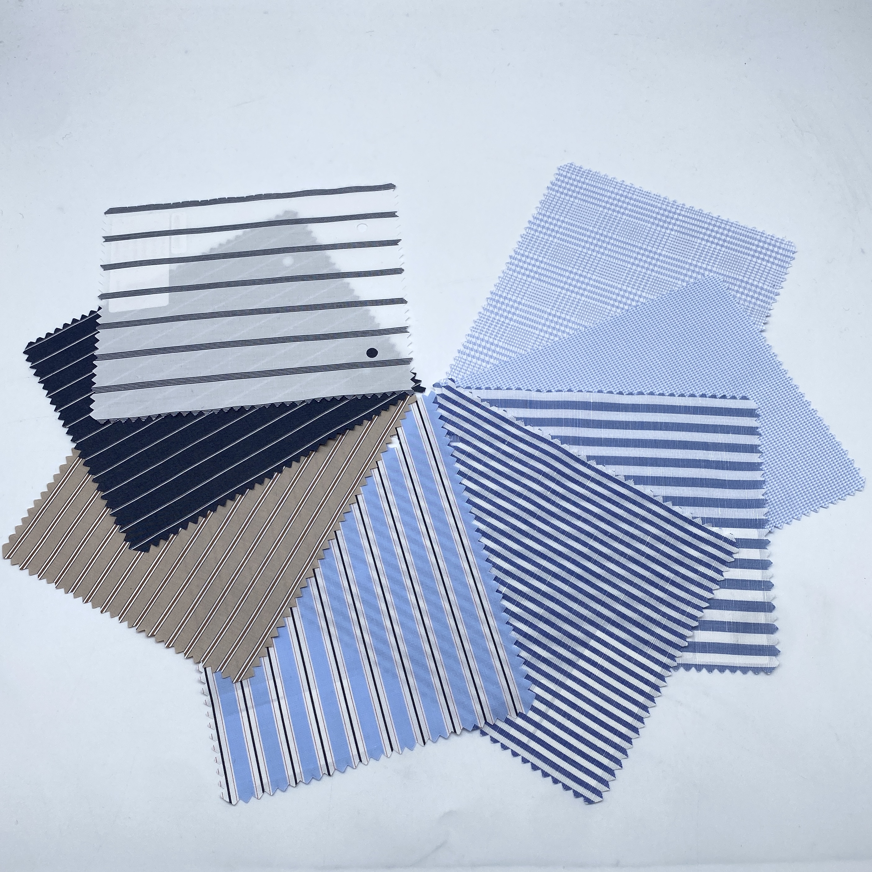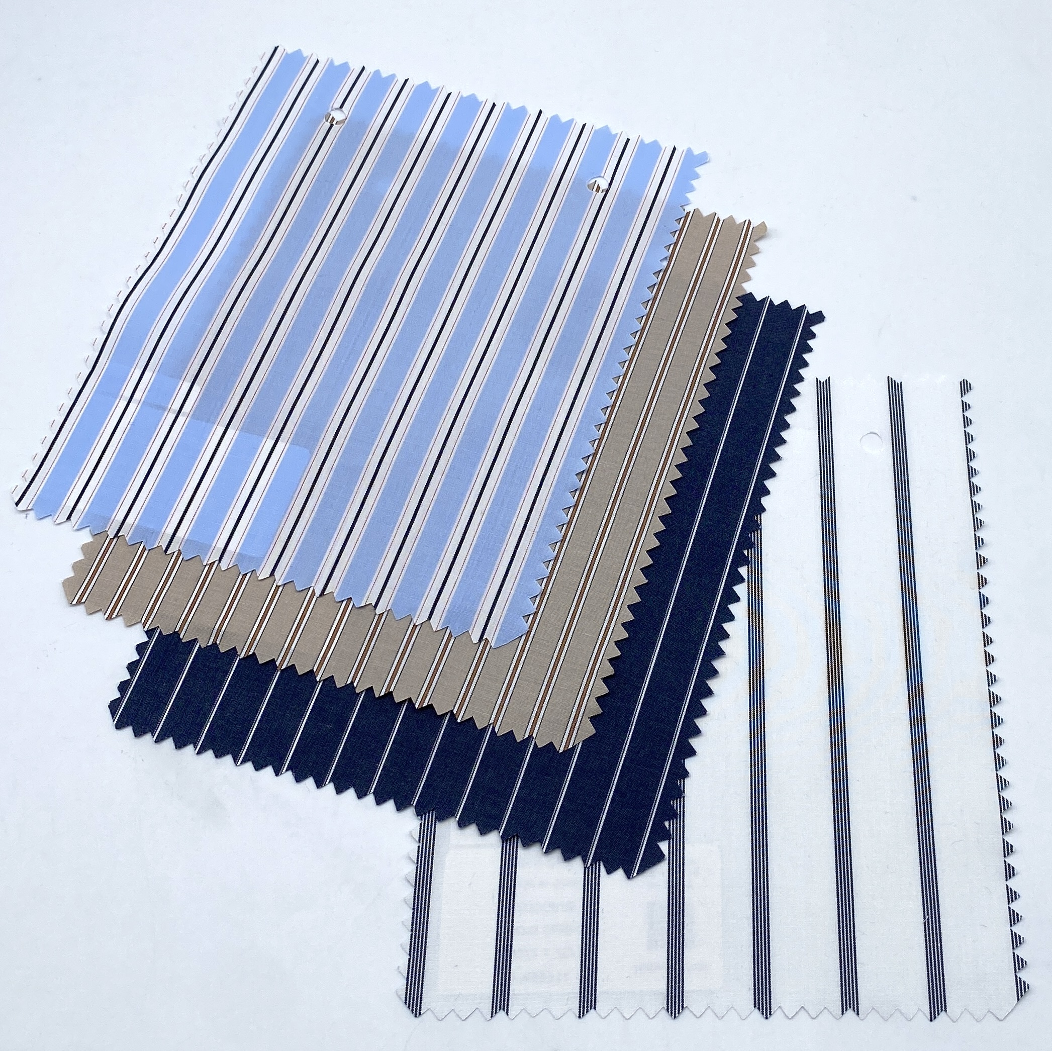 FM89712(上から3番目):ネイヴィブルーベースのダブルストライプです。こちらもまた「地付きストライプ」、ダブルで入ったホワイトストライプがさりげなく違う表現(1本はペンシルストライプで1本はピンストライプ)で描かれているのがイイですよね!今回入荷した4マーク中最も個性が弱めと思いきや、実はこちらにはEasy Care機能(イージーケア:Wrinkle Freeほど強くない形態安定機能)が付加されています!なので、洗濯後に「パンパンパン!」と整えて/伸ばして干すとほぼほぼシワがなく乾きます。が、カジュアルシャツを作った場合は敢えて整えずに干して若干のシワを残したまま着るのもいいかもしれませんね!いい具合のナチュラル感が残ったまま乾くと思います!また、こちらはこう見えて(?)繊細でシルキーな肌触りなのも魅力です。なので、エレガントなドレスシャツにもバッチリだと思います。僕はこちらなら2つの相反するアイディアが頭に浮かびます!ひとつは思いっきりドレッシーなデザイン。もうひとつはLibertyプリント素材と組み合わせたカウボーイシャツ/ウエスタンシャツです。どちらもすごくハマりそうです。糸番手は経糸が100番手双糸(ソウシ)で緯糸が70番手単糸です。もっと細番手を想像させる見事な肌触りが素晴らしいです!ご来店の際にはぜひ触ってみてください。オーダーメイドシャツ(税込):¥23,100~