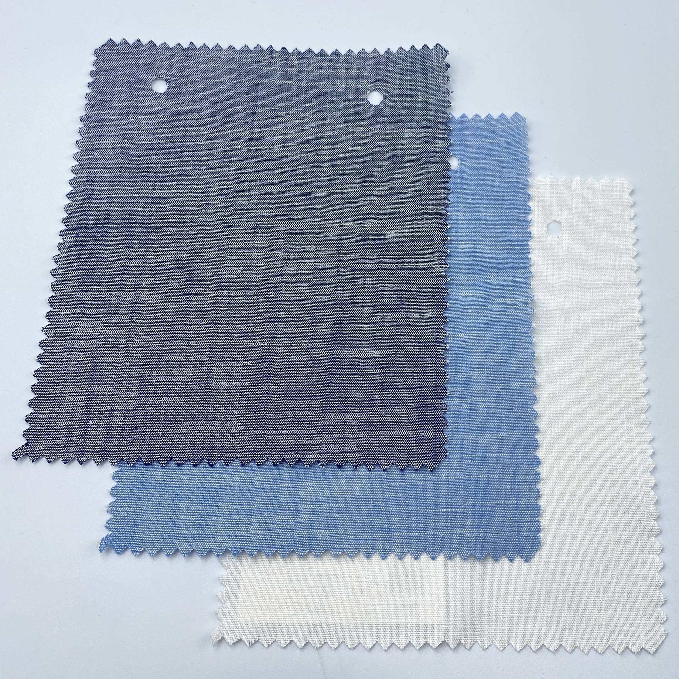 いずれも品質は100% Cotton、糸番手は前者が経糸(タテイト)・緯糸(ヨコイト)とも28番手単糸(タンシ)で後者が経糸が40番手単糸・緯糸が10番手単糸です。