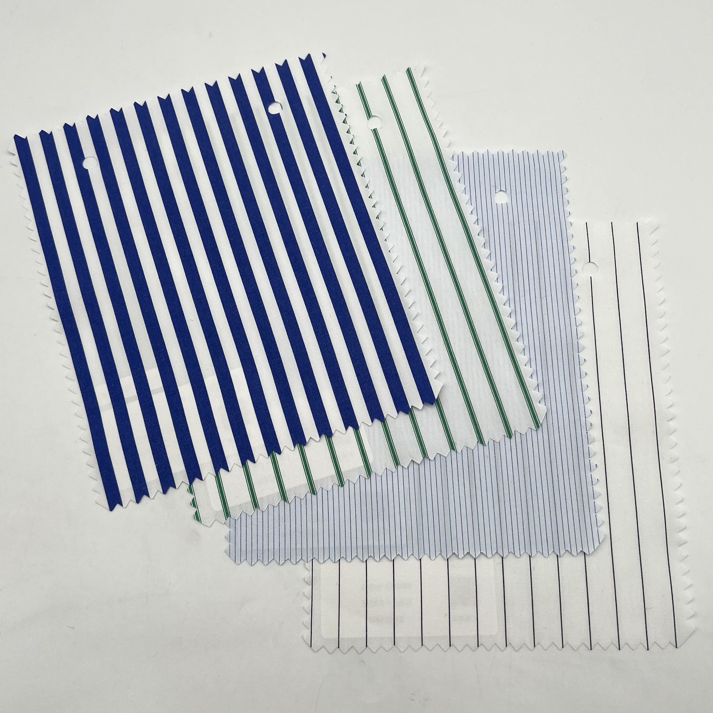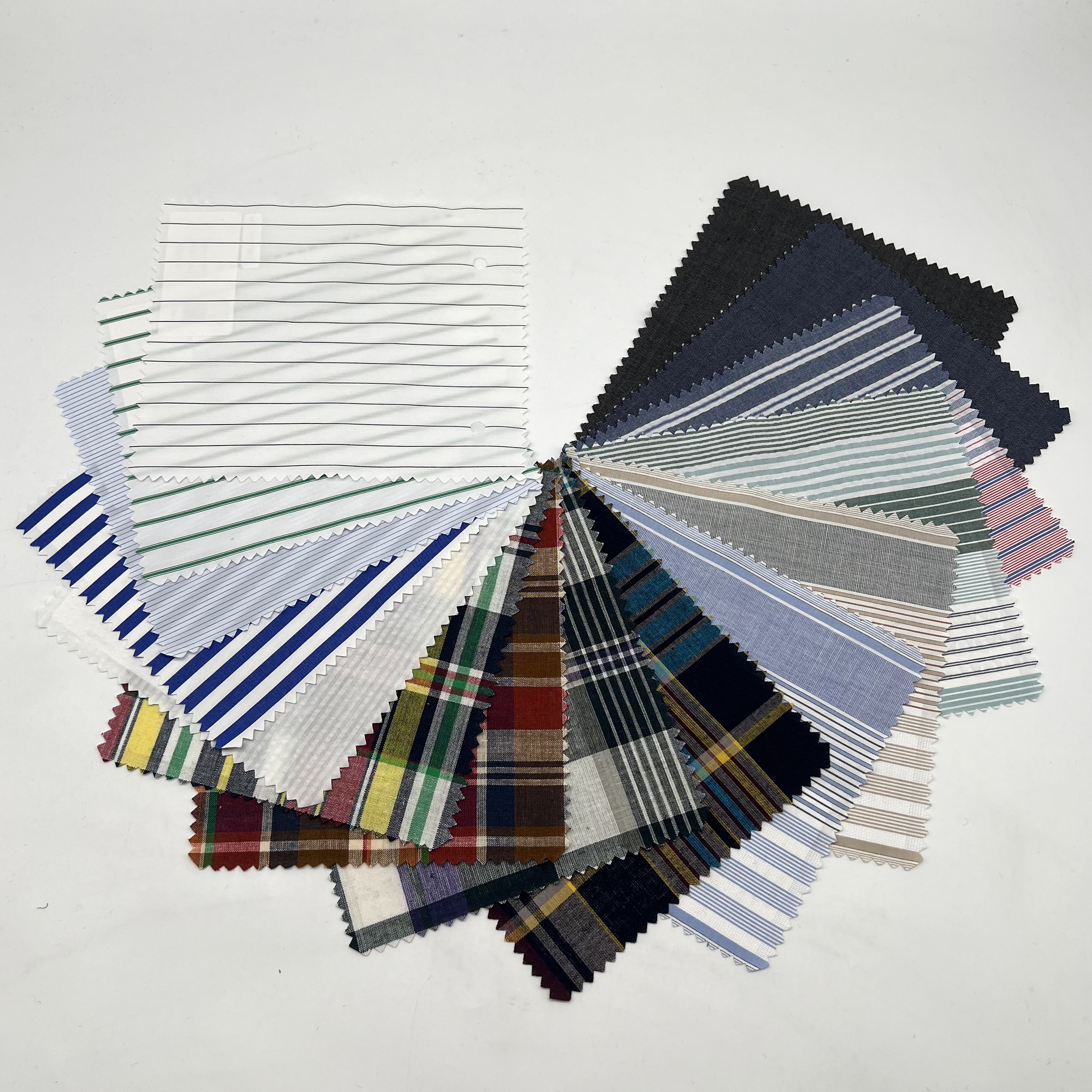 FM12910(右下):WhiteベースにBlackのピンストライプです。Shirting(シャーティング:シャツ向けテキスタイル)業界ではこのタイプのダークカラーをBlackと表現することが多いのですが「実際にはDark Grayかな?」とも思います。いずれにしても極めてシャープでクールなストライプではないでしょうか?Black(あるいはDark Gray)のピンストライプはなかなかレアですので気になる方はぜひともお早めにお願いします。