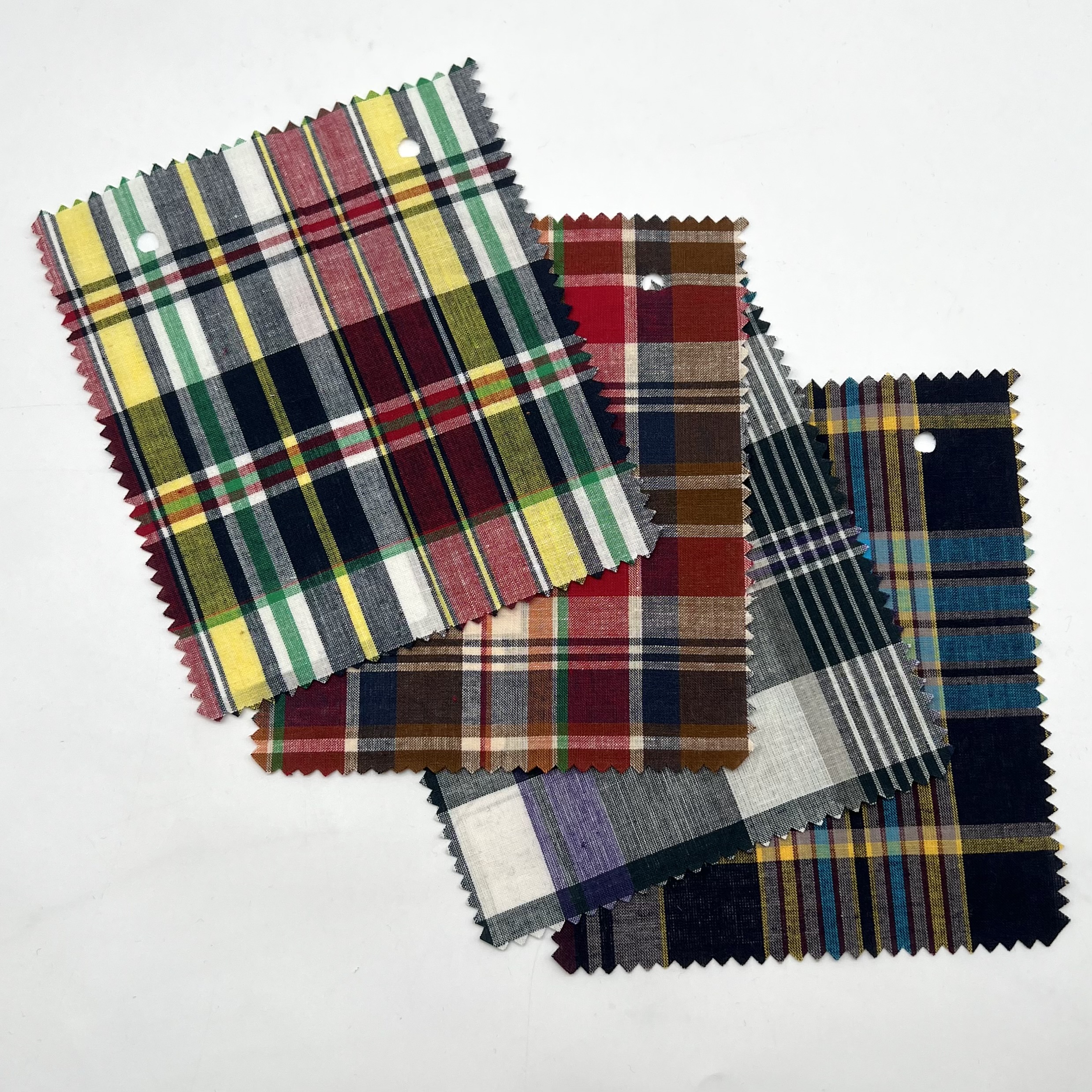 FM12915(上画像左上):Navy BlueベースにGreenやYellow、Wine Red、Whiteといったたくさんのカラーを使った爽やかでややタータンチェックテイストが強めのインディアンマドラスです。