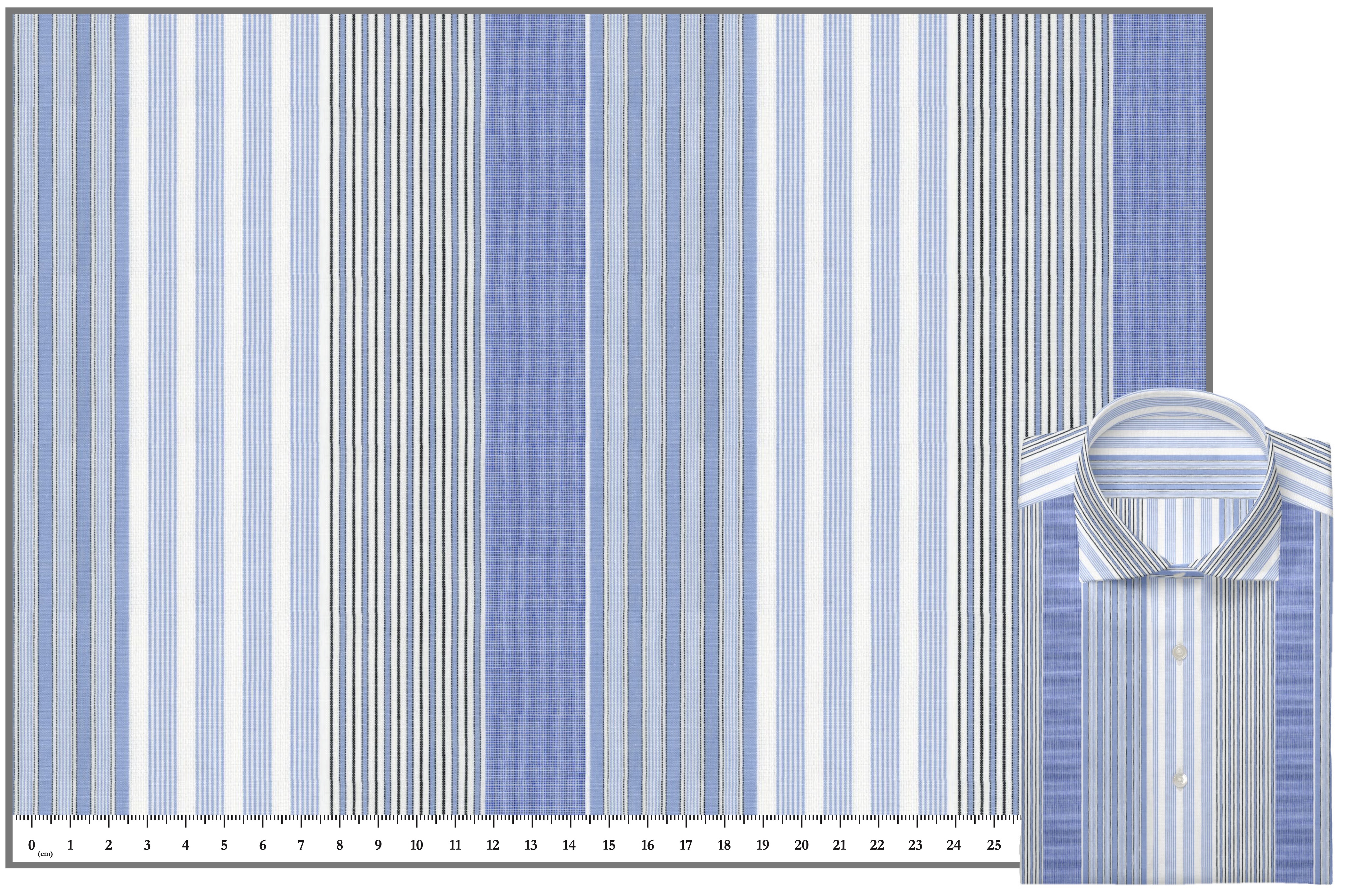 FM12913(左上):鮮やかなBlueとWhiteのボールドストライプです。我々がロンドンストライプと呼ぶ典型的なストライプですね。細番手ボディかつこのストライプなのでジェントルマンなドレスシャツを作るのが「正攻法」ではありますが例えばバンドカラー等のカジュアルシャツを作ってもすごく素敵な仕上がりになると思います。