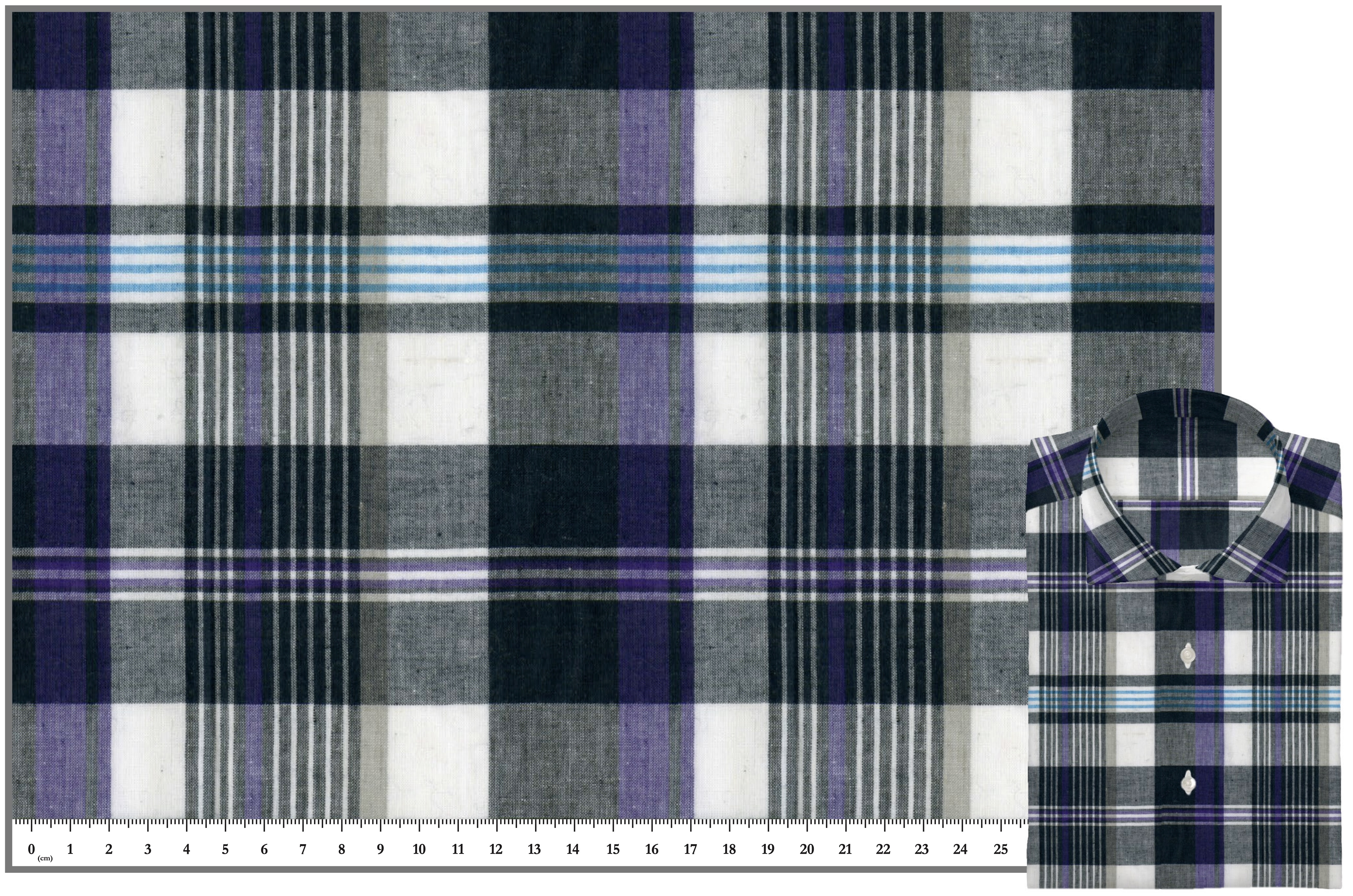 FM12917(上画像左上から3番目):カジュアルな中にも気品を感じさせるPurple, White and Navy Blueのトリコロールインディアンマドラスです。比較的落ち着いたカラーリングなので敢えてドレスシャツを作っても楽しいと思います!