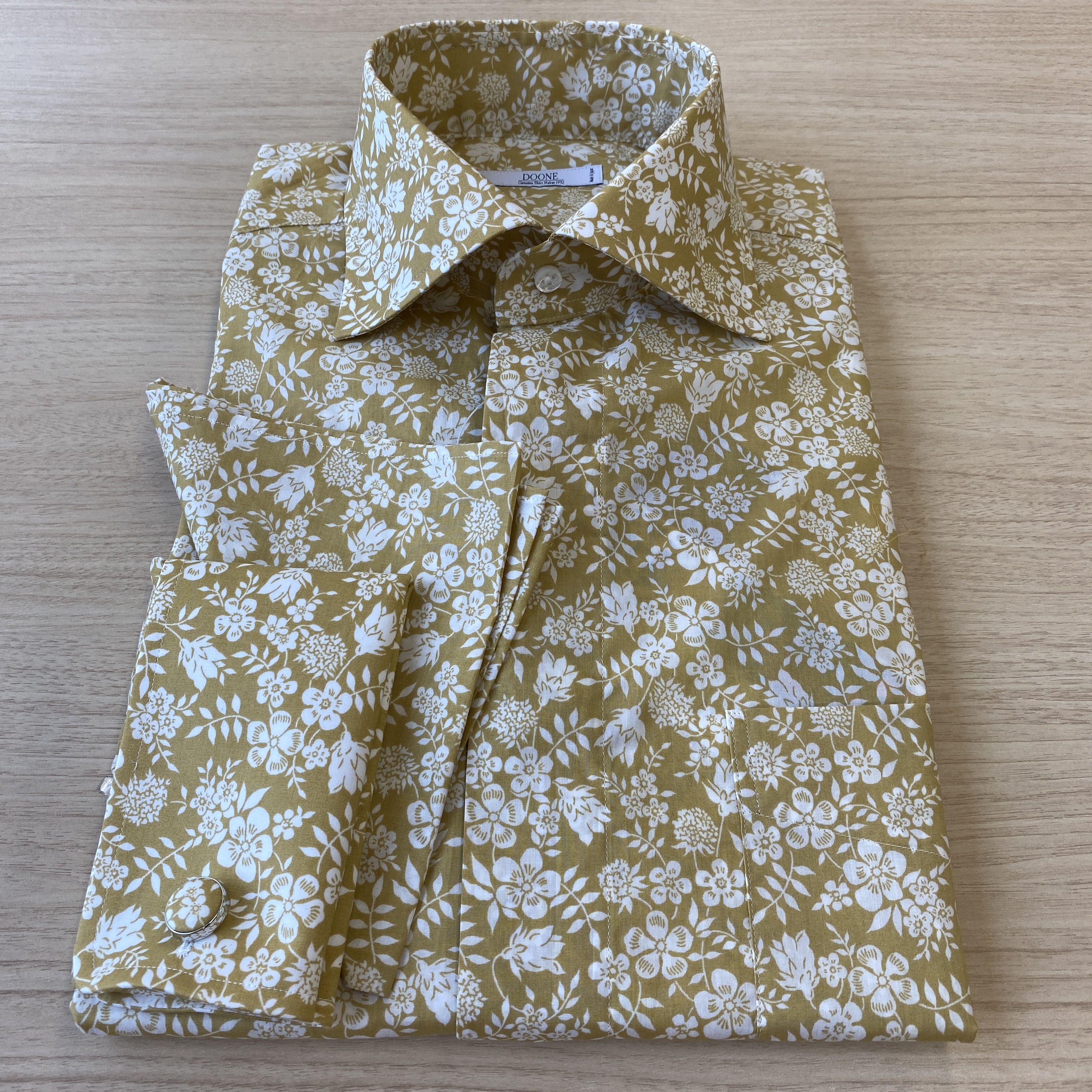 ボタンはブラウンマザーオブパール(茶蝶貝)ボタン、カラー&カフスにはグリーンのハンドスティッチを入れたいですね。
