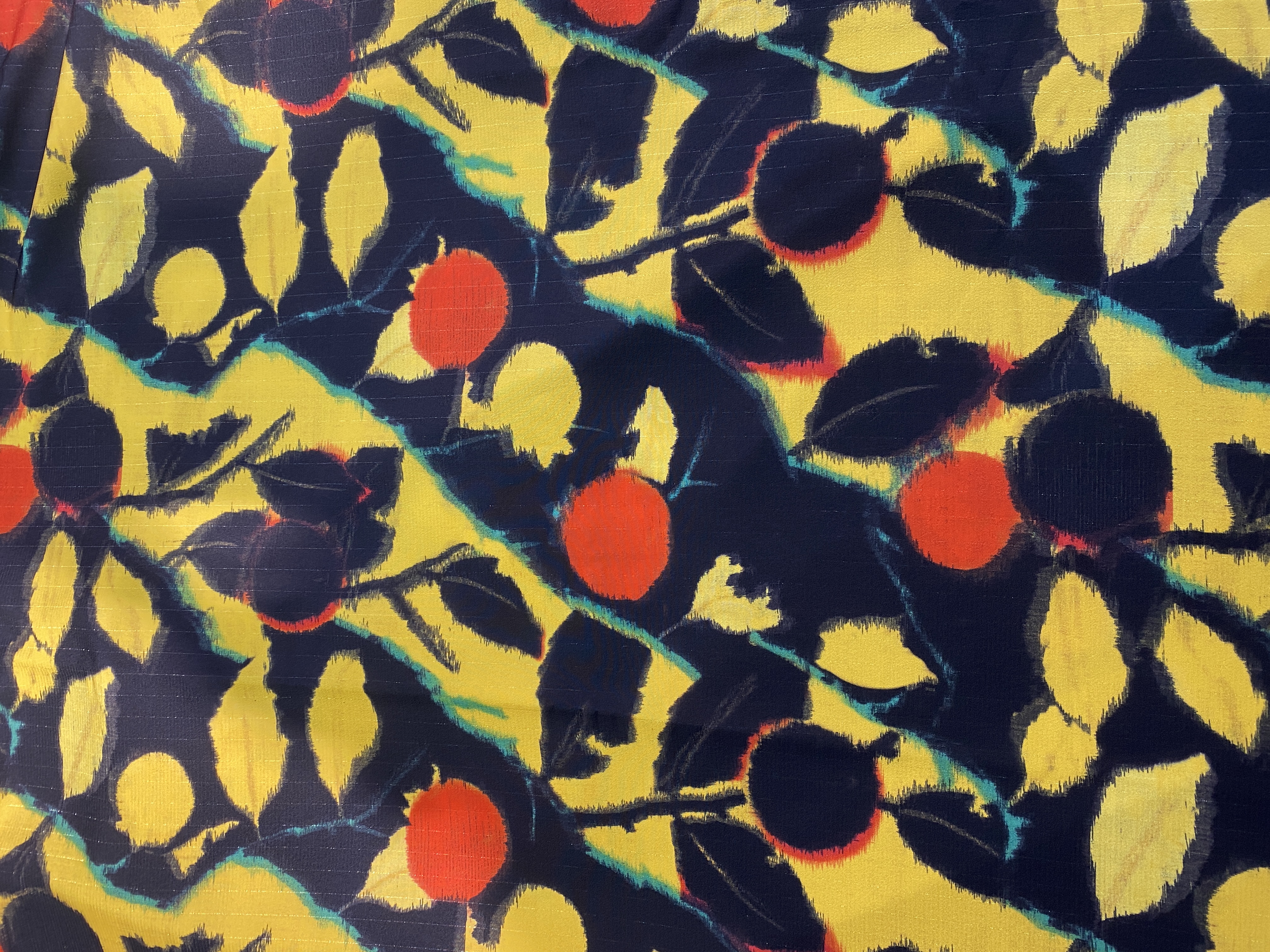 「柿」をイメージしたRed, Yellow, Green, Blackの大胆不敵なプリントが施されています。