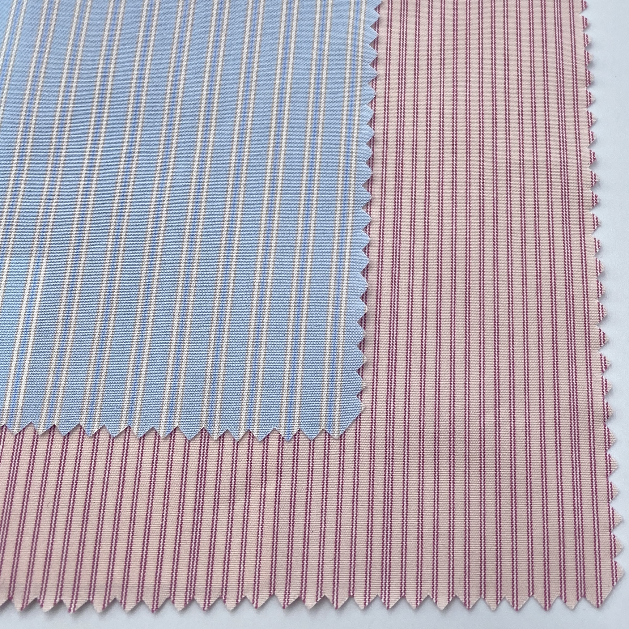 品質は100% Organic Cotton、組織はポプリン/ブロード、糸番手は左のBlueが経糸・緯糸ともに50番手単糸で右のPinkが経糸・緯糸ともに60番手単糸です。