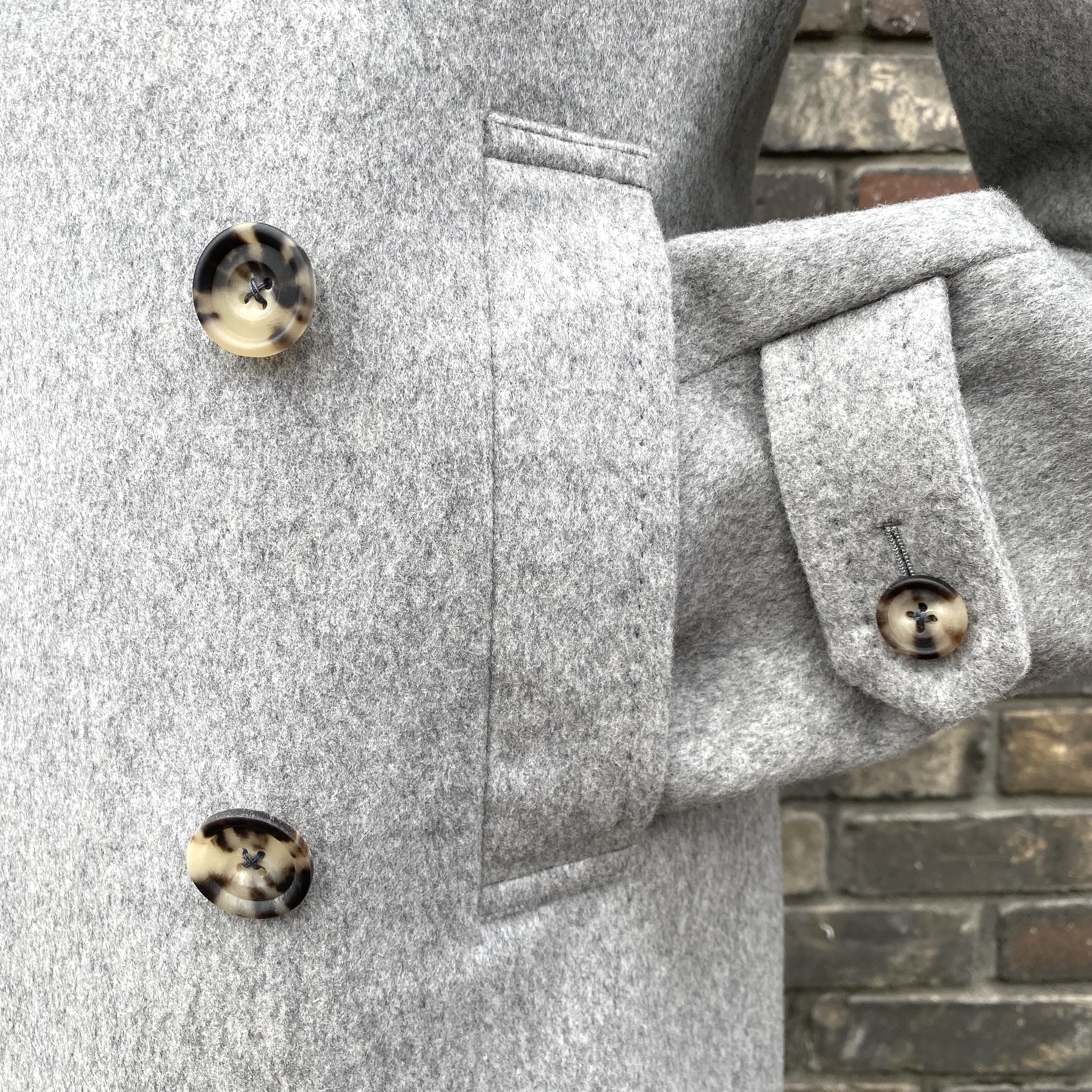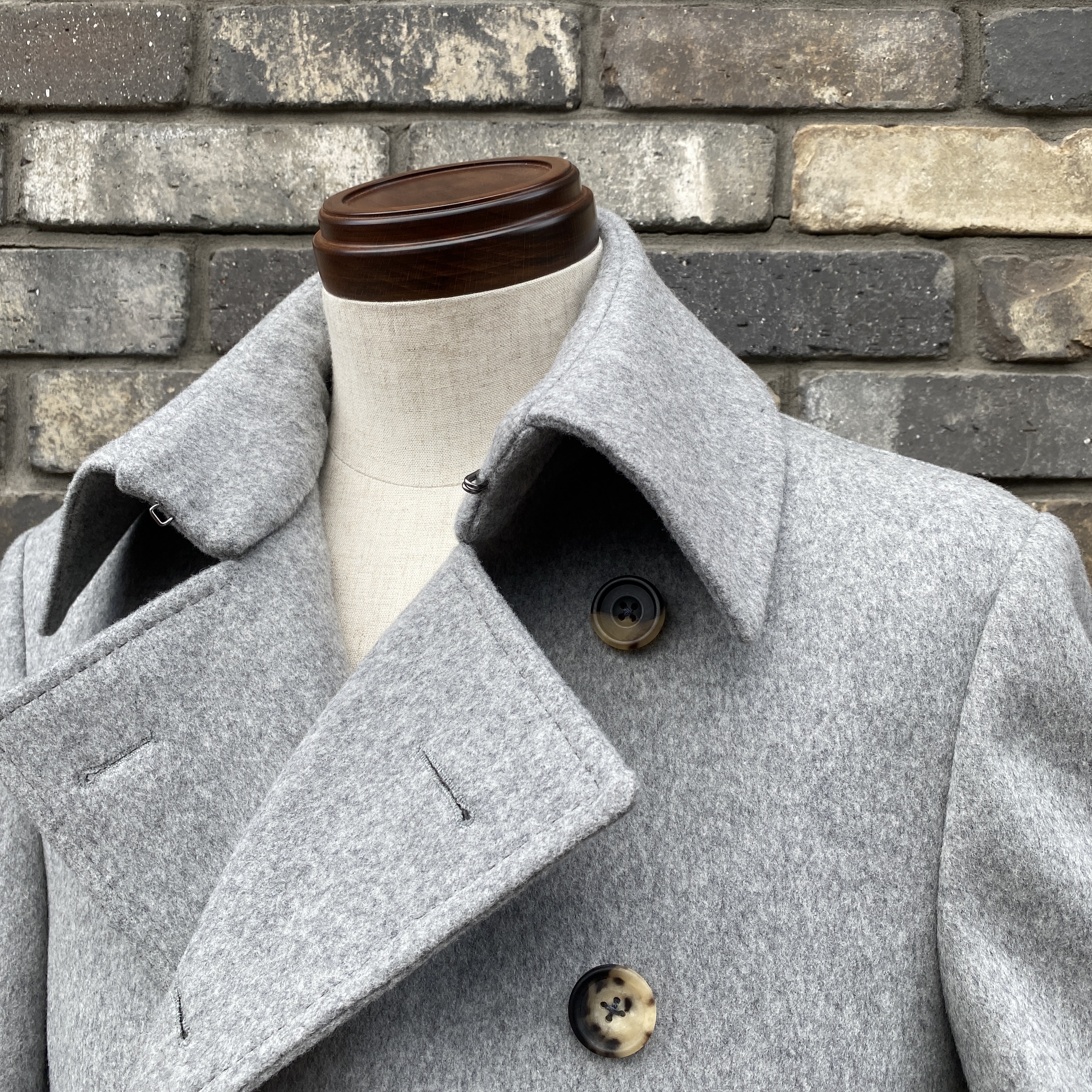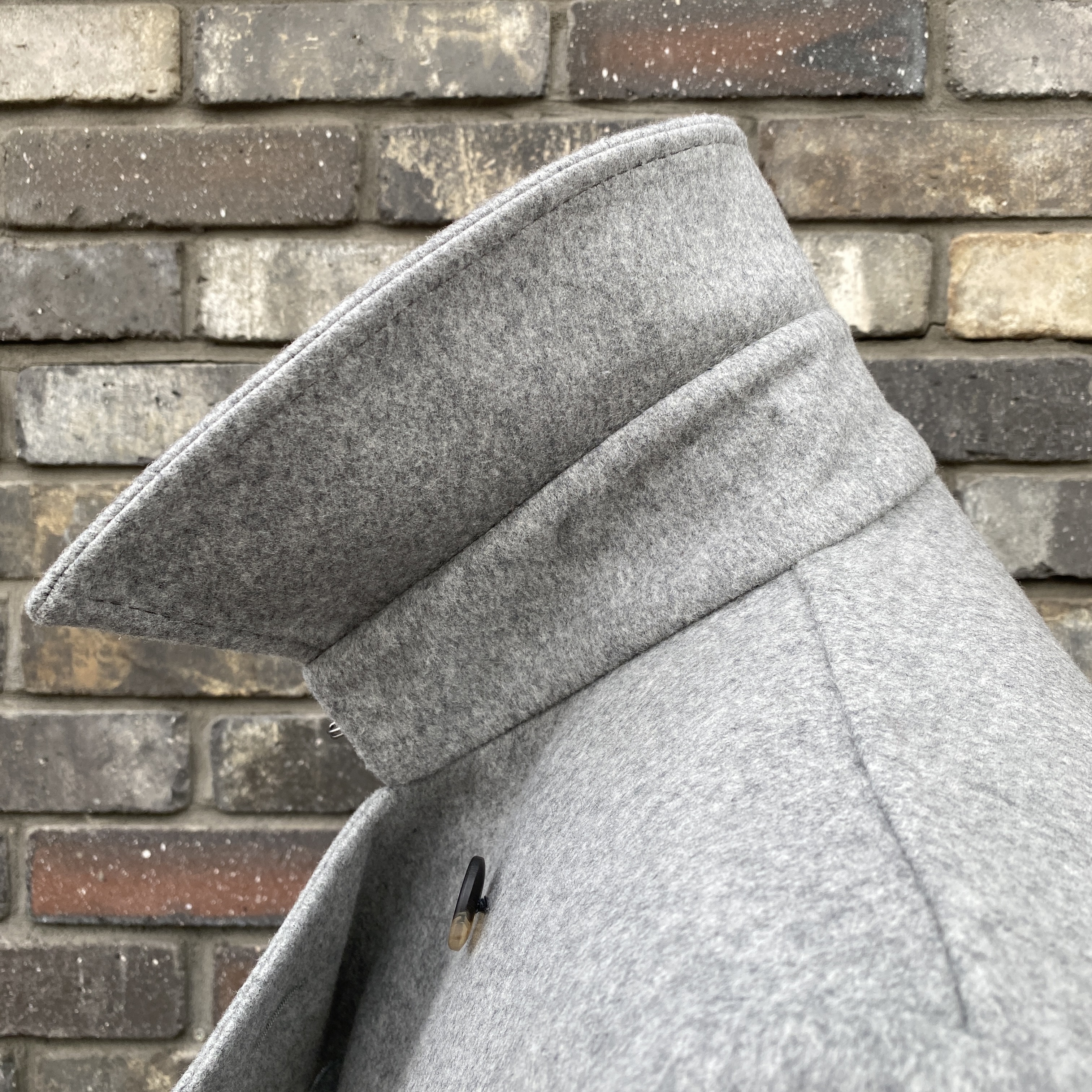 「エレガントなピーコート」というテーマで承ったので、一般的なピーコートで使われるメルトンよりもソフトなボディかつ気品があり洗練されたライトグレイのこの素材はベストセレクションだと思います。
