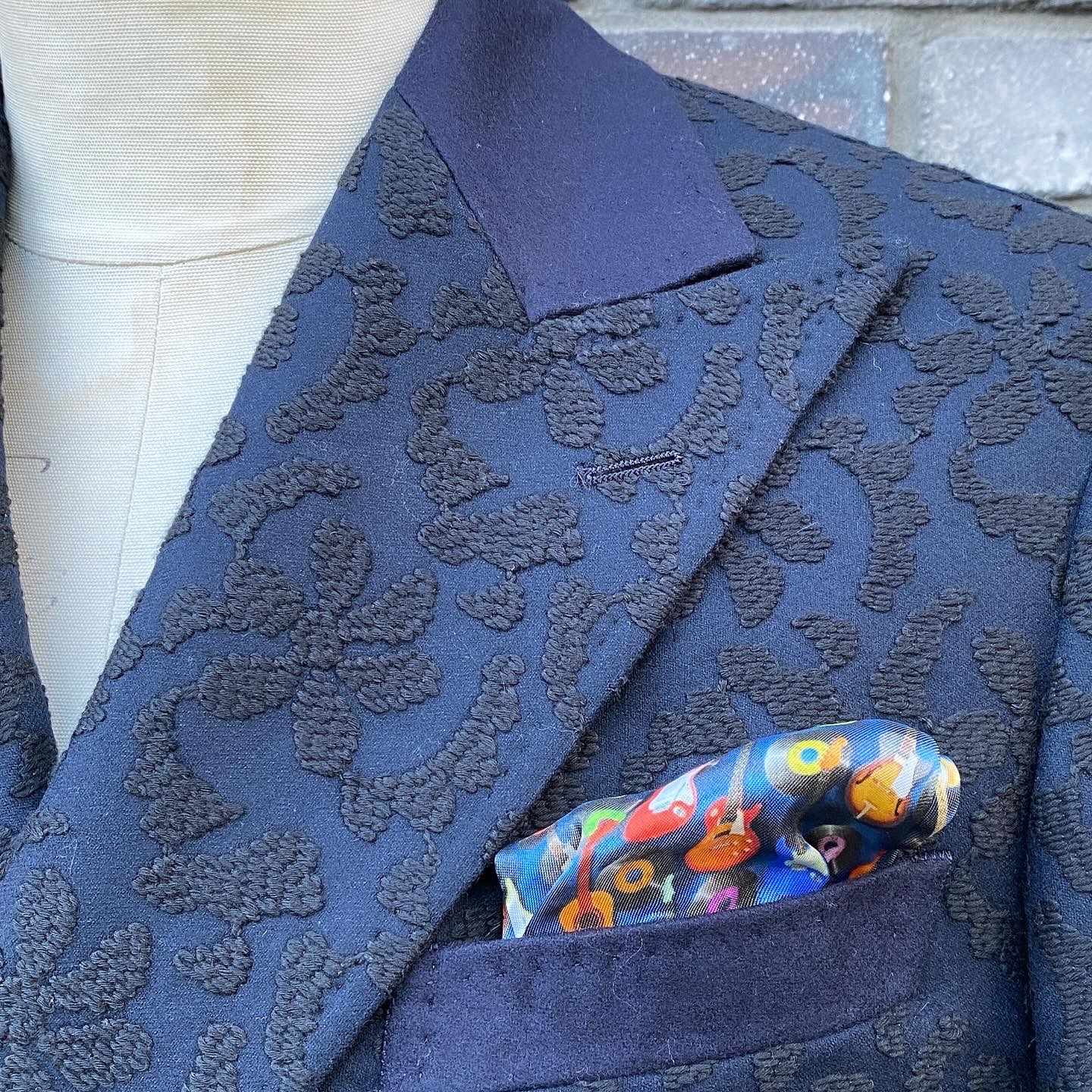 「スリーヴライニング:目の部分がハートにも見えるロックなスカルライニングで代用したカラークロス(上衿裏)」「スリーヴライニングを使ってポケットスクウェア(チーフ)代わりに出せるようにした胸ポケットの袋地」「たくさんのリアルなギターとカラフルなLPレコードが並んだmade in Italyのプリントライニングを使用したボディライニング」「スカルモチーフのシルヴァーメタルボタン」「下前内ポケット上にブルー糸でお入れしたRITMO THE CONDO刺繍」「上前ラペル(下衿)裏にブルー糸でお入れしたWITHOUT RHYTHM LIFE IS FLAT. 刺繍」といったオーダーメイドでしかあり得ないディテイルも見逃せません!