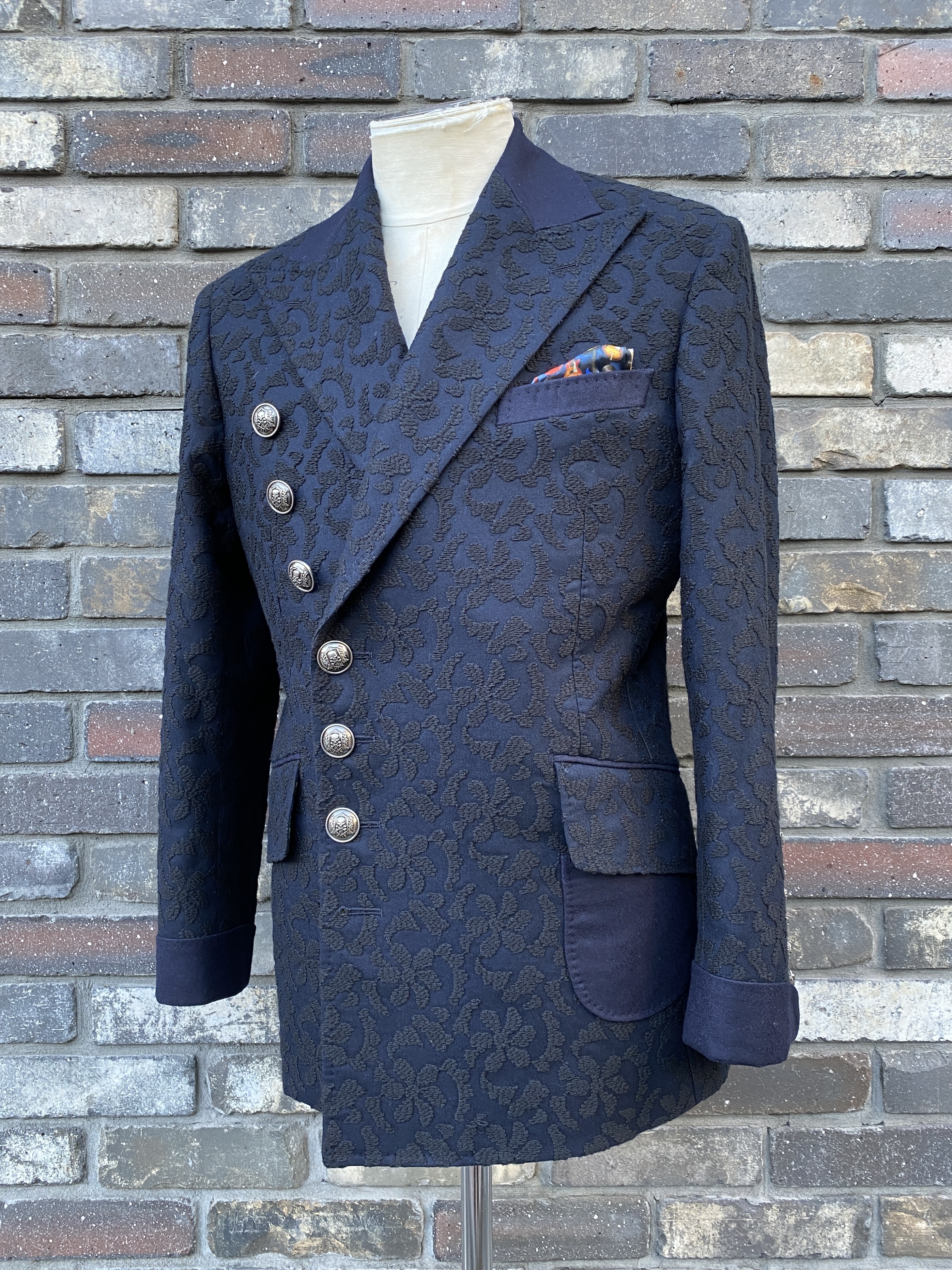 スリーヴライニングのスカルおよび表素材のボタニカル刺繍と見事なハーモニーを奏でていますもの!
