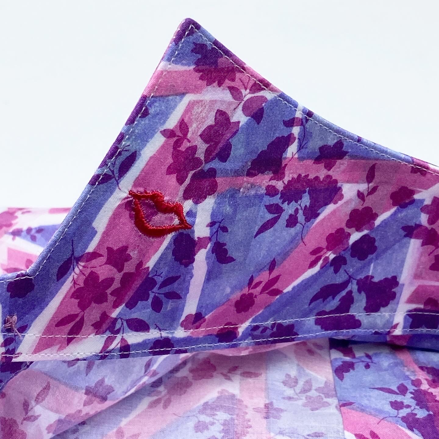 また、ウイングカラーの内側にはキスマーク刺繍をレッド糸でお入れしました。