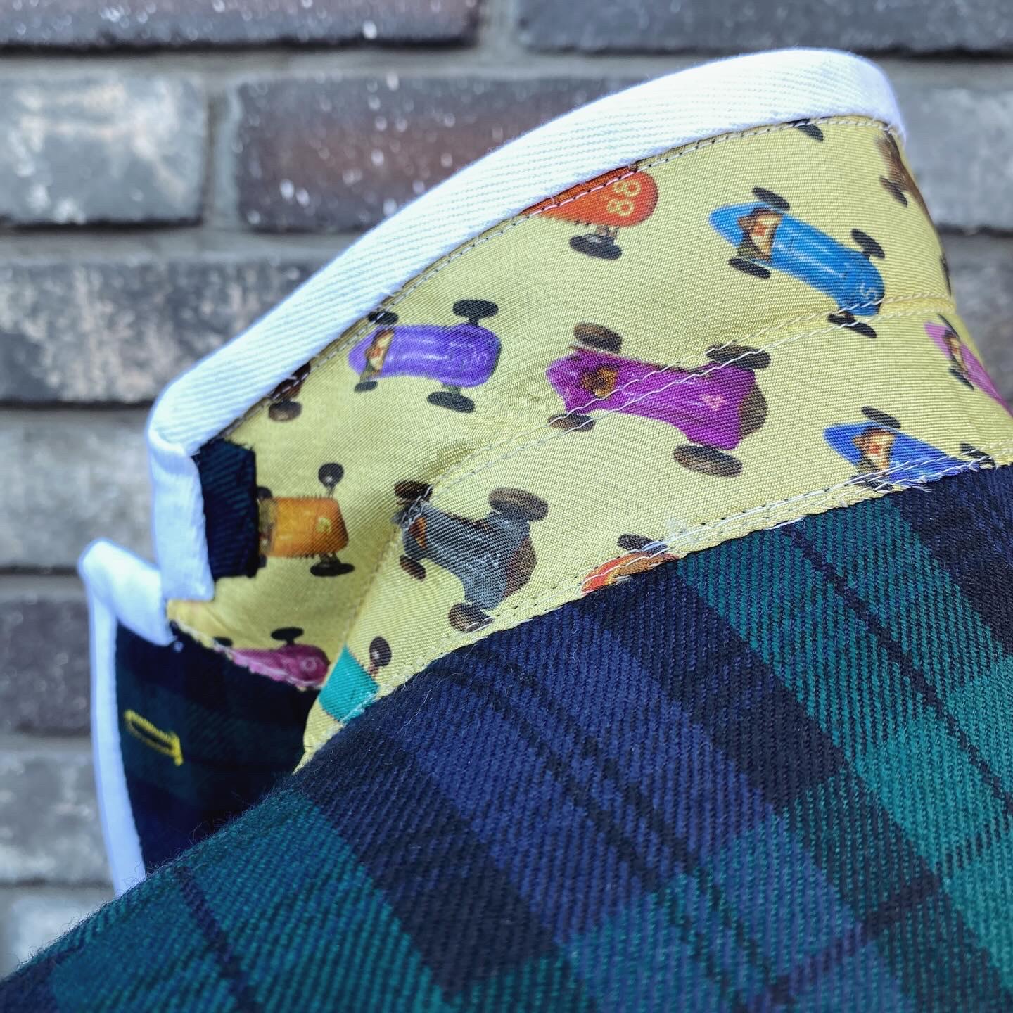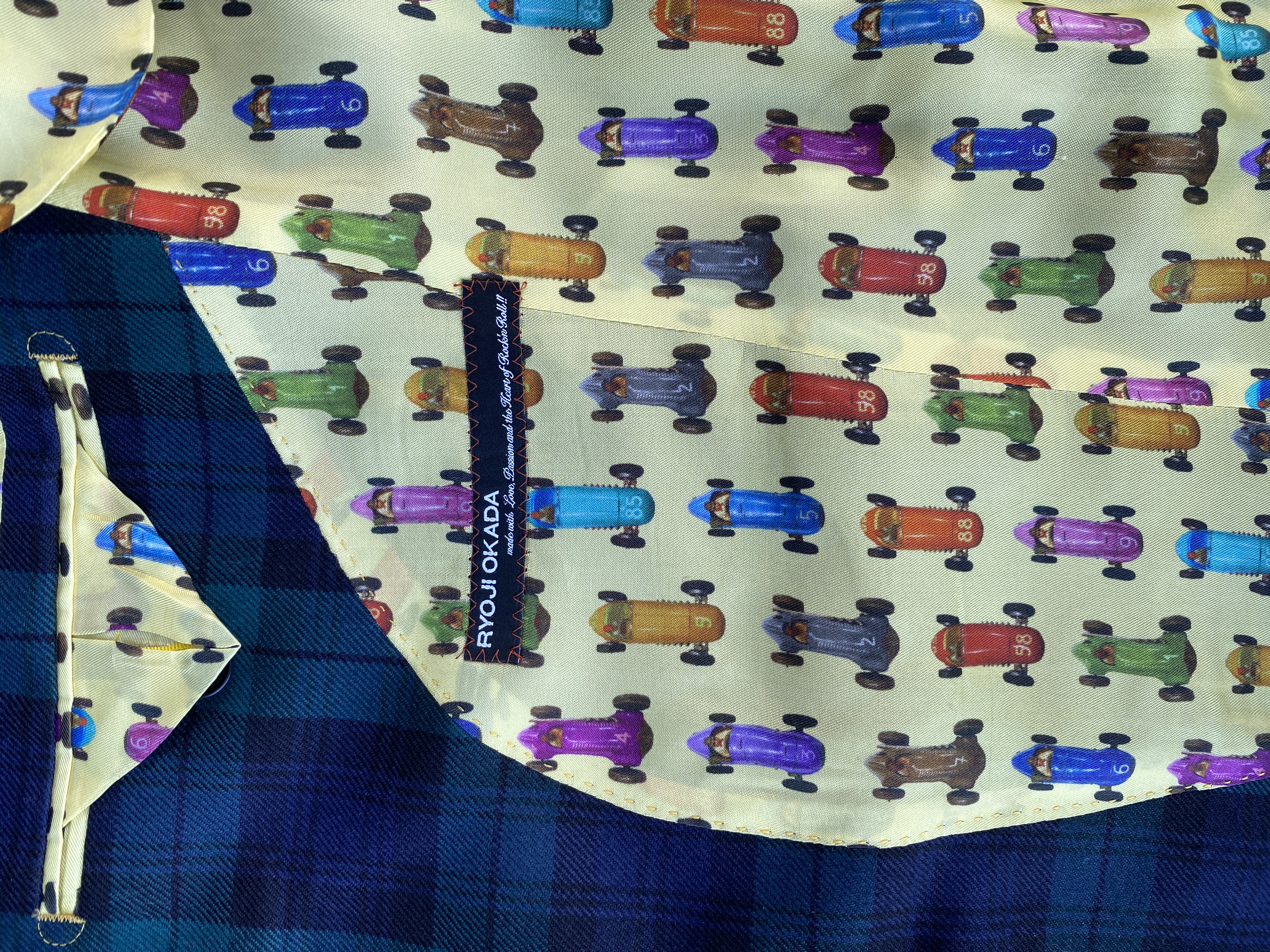 カラークロスはバイアスに裁断する必要があるのですが、そのせいで斜め上にヴィンテージカーが走っているのもすごくいいと思います。