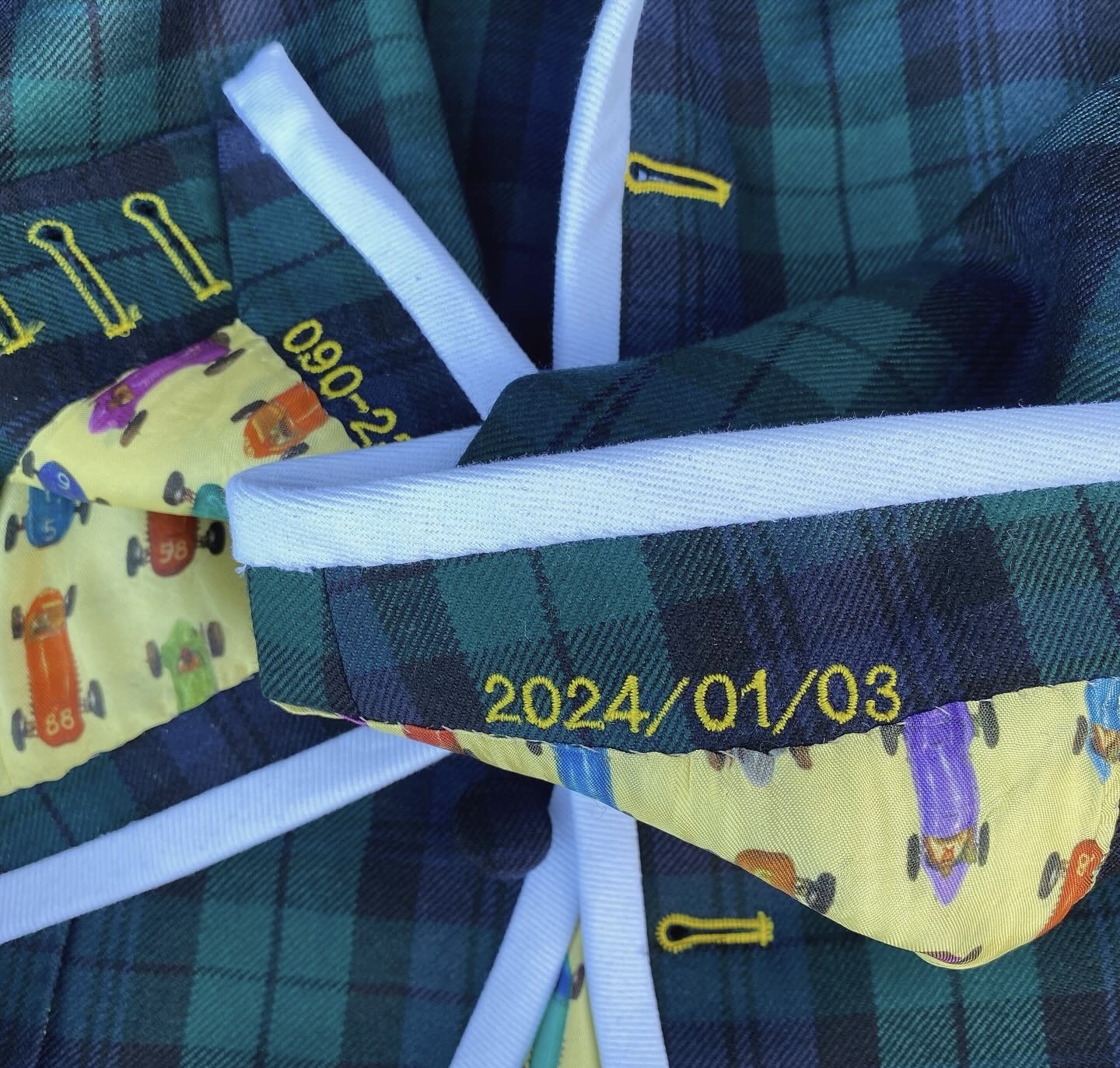 左の袖先裏にはNAMICLEのリリース日を、右の袖先裏にはN様の携帯電話番号をイエロー糸刺繍でお入れしました。