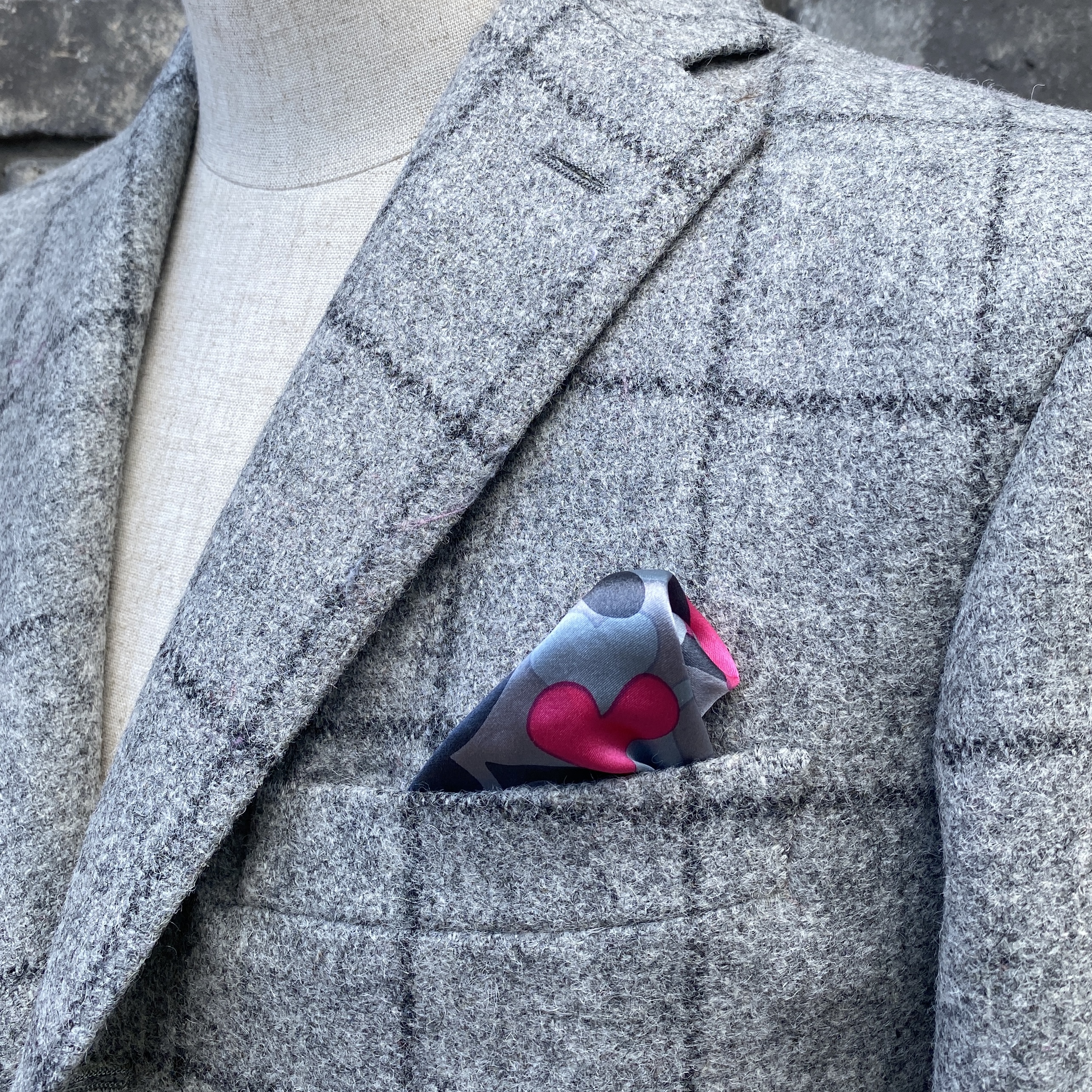 「表素材とカラーを反転させたようなミニウィンドウペーンのカラークロス(上衿裏のフェルト生地)」「美しいミディアムグレイのリアルナットボタン」「腰ポケットとアングルを連動させたスランテッドリアルボタンホール(本開き切羽)」「表素材と完璧なハーモニー&コントラストを生み出している “♡ Camo” silk c/# GPライニング」といったオーダーメイドならではのエキサイティングなデディテイルも見逃せません。