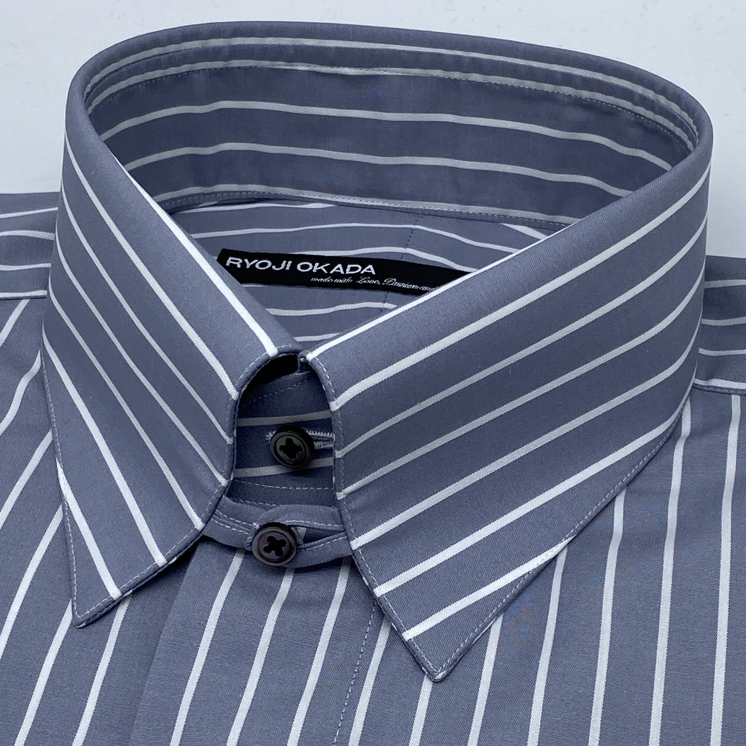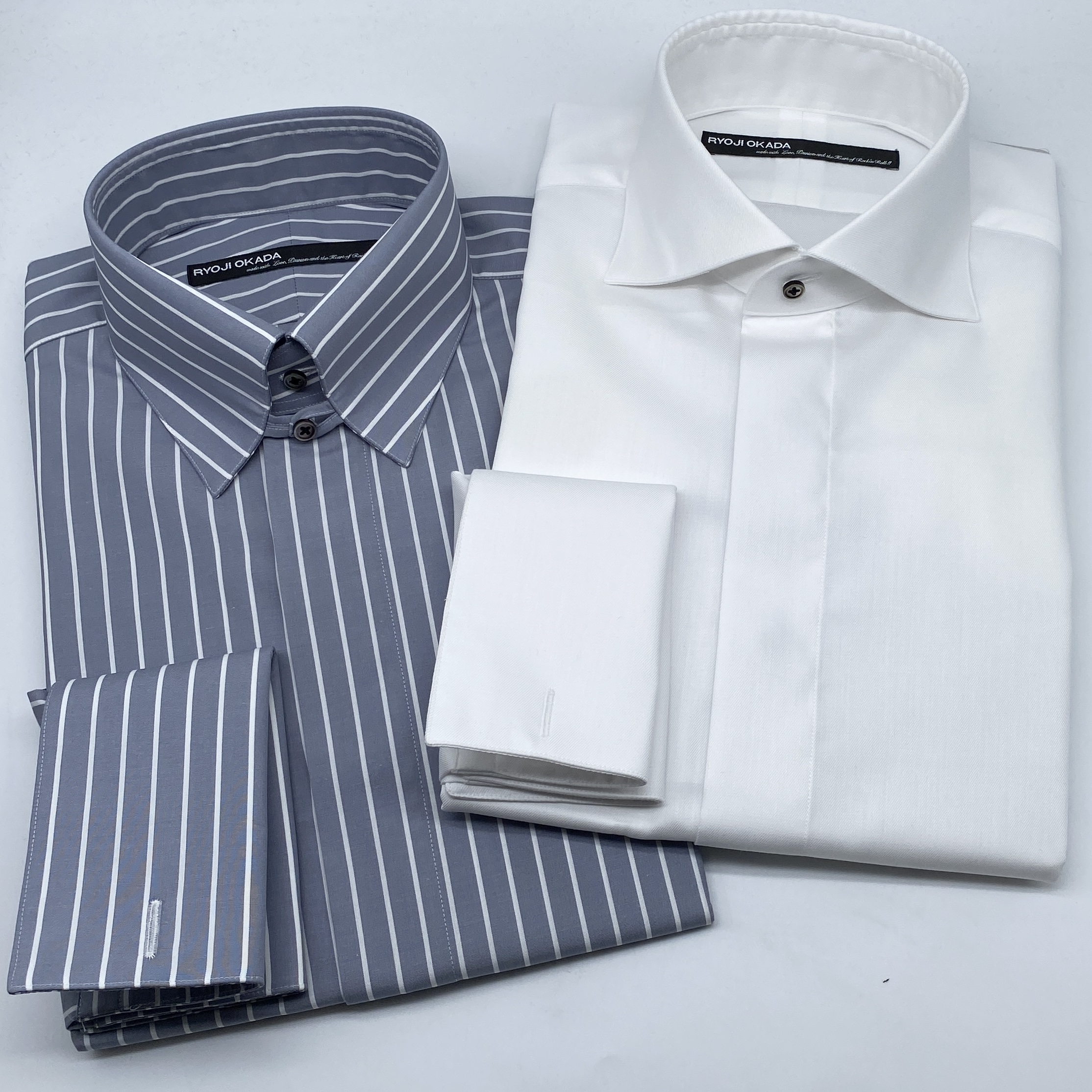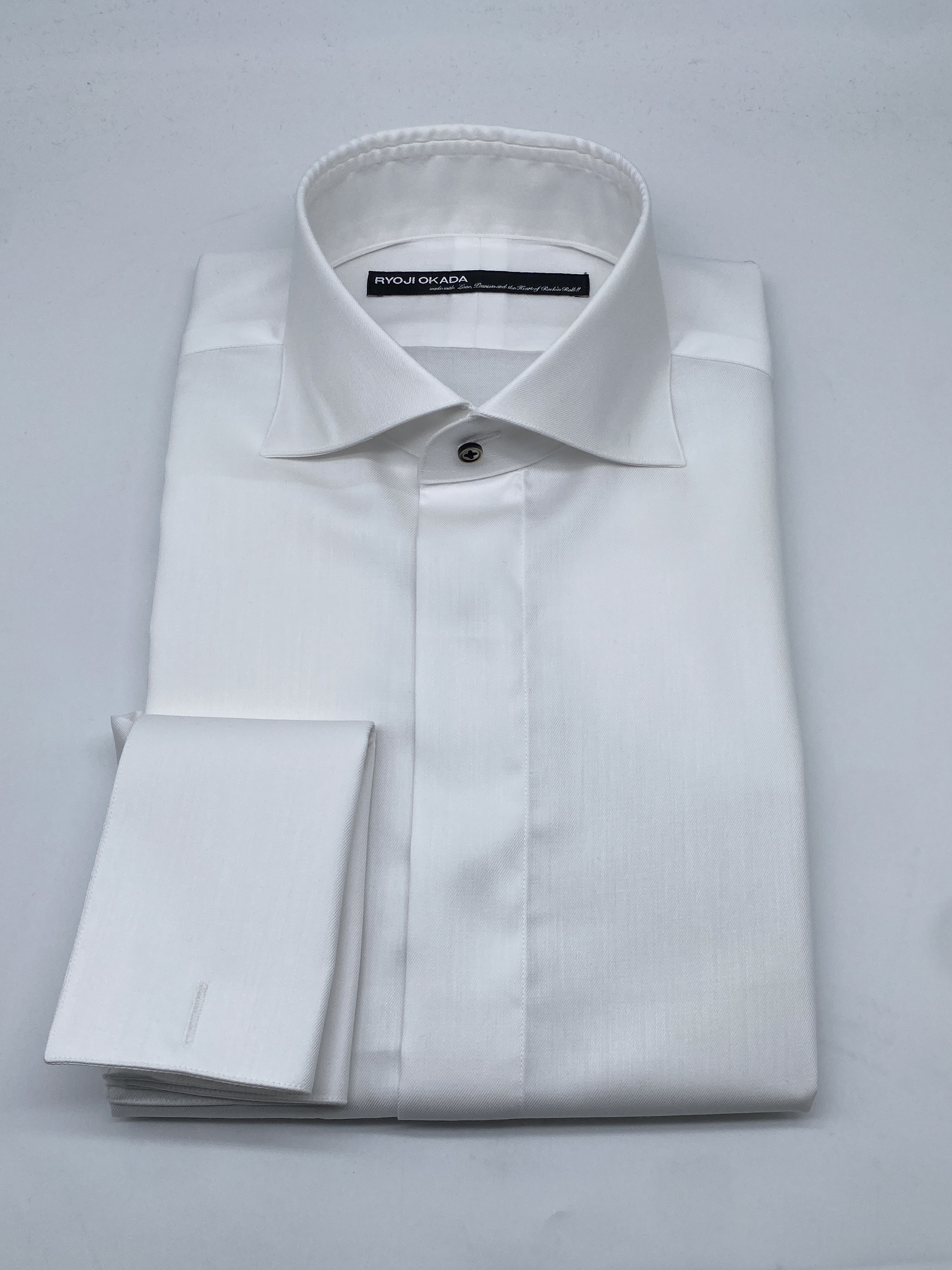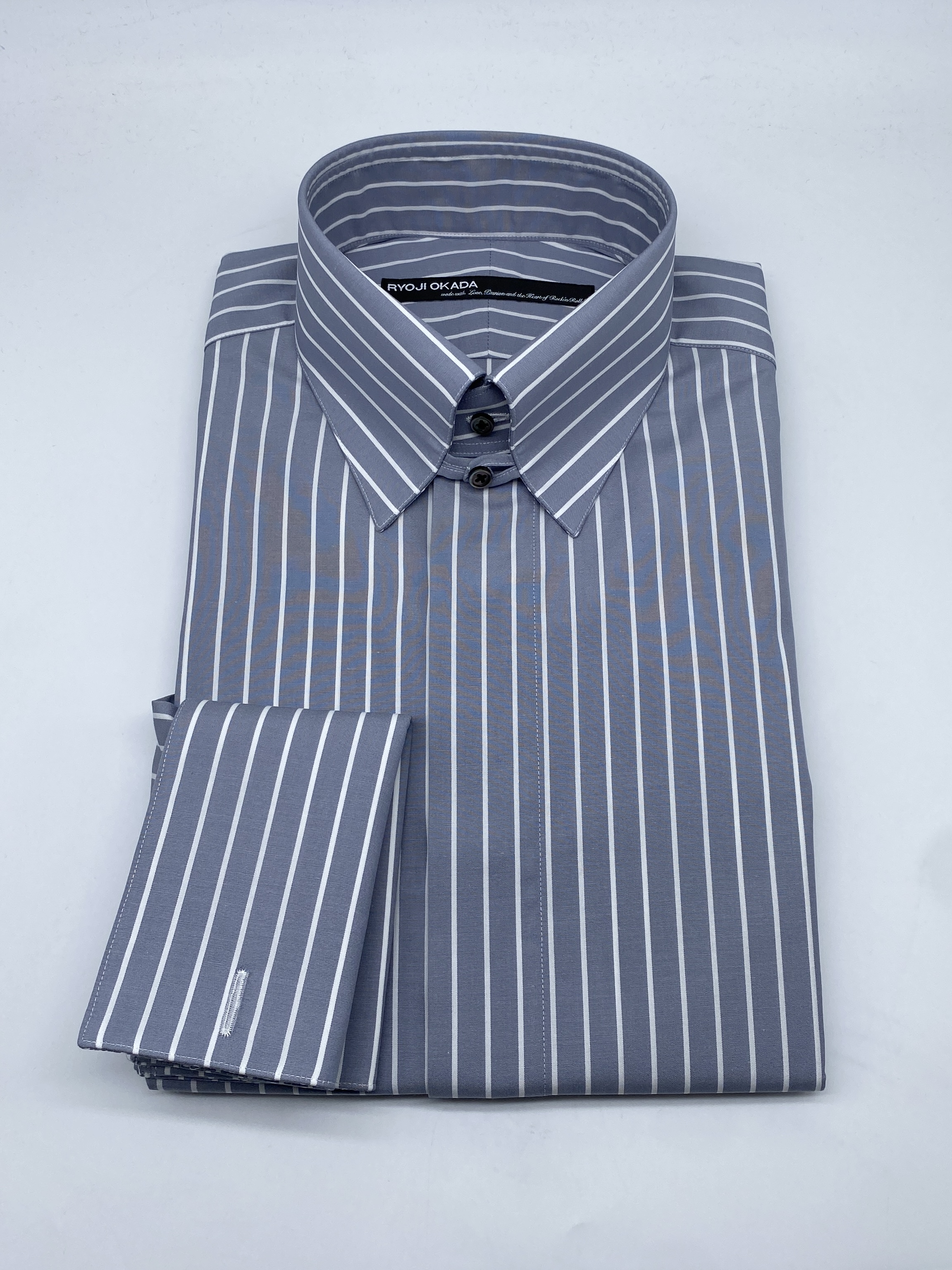 具体的には「ループ&ボタンスタイルのNewタブカラー」「スクウェアフレンチカフス(ダブルカフス)」「フライフロント(比翼仕立)」「胸ポケットレス仕様」というデザインでお作りしました。