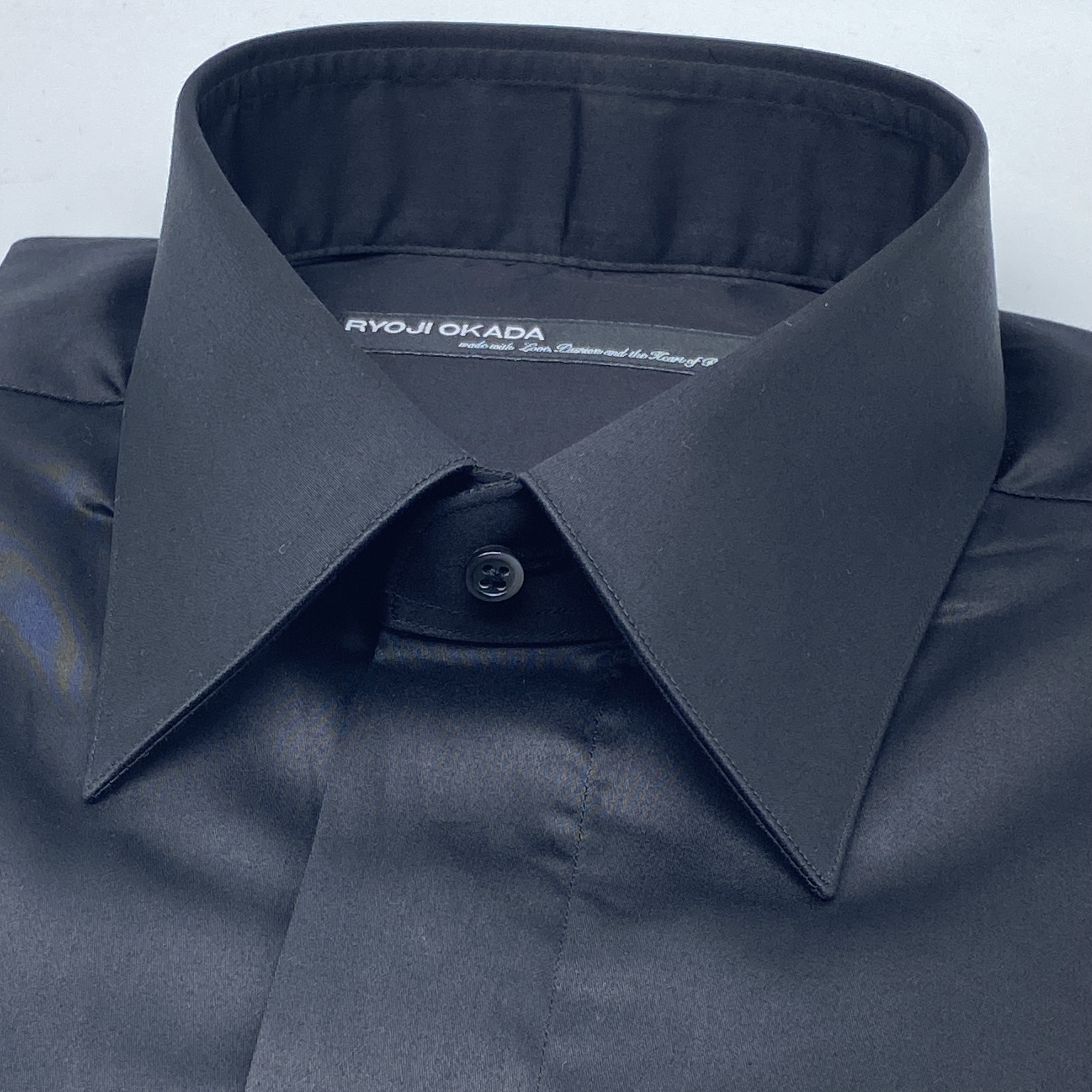 国産の定番素材が収録されているバンチブック:Basicsにコンパイルされているブラックサテンでお作りしたシャツです。