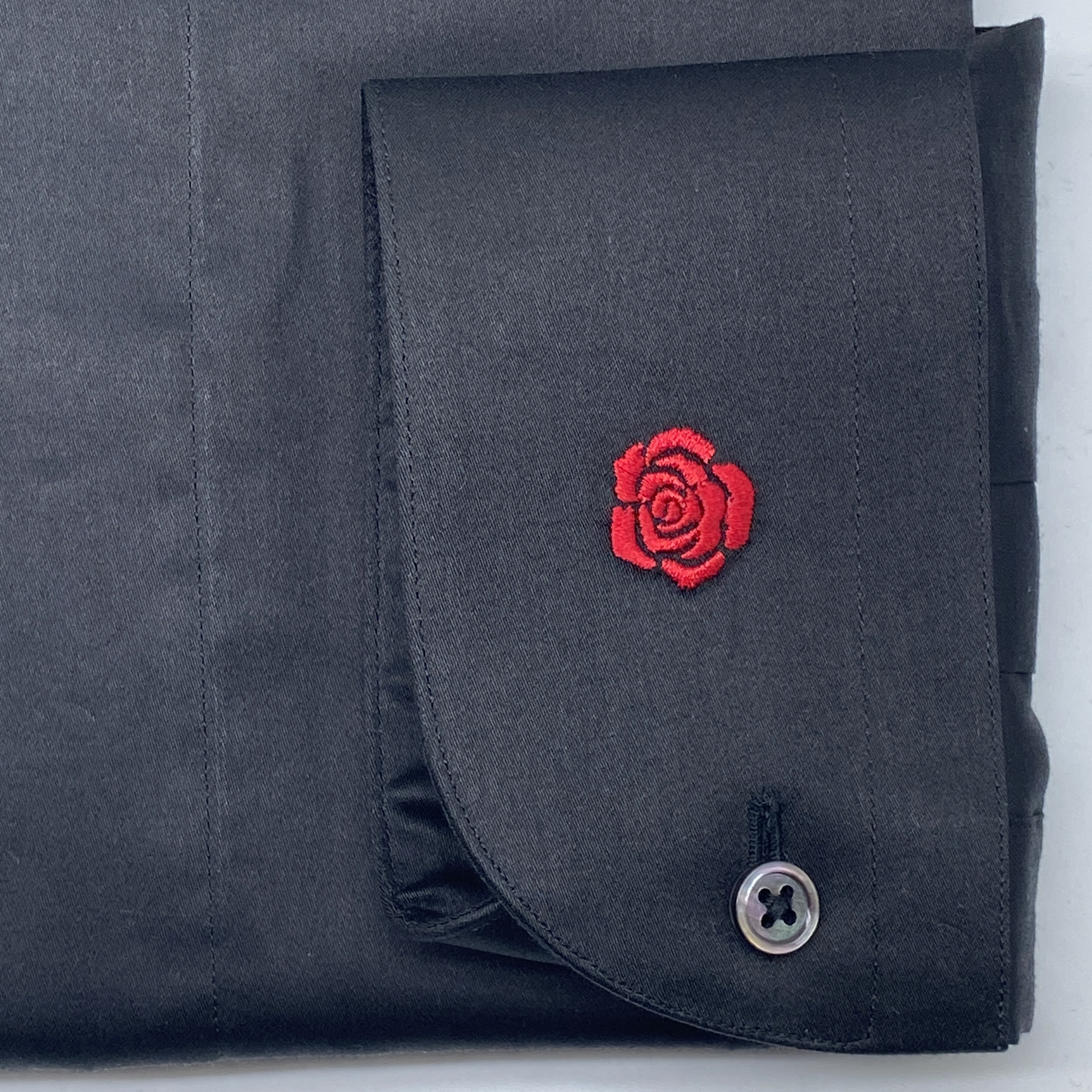 こちらもシャツと同じなのですが「素材とベストマッチしたブラックマザーオブパールボタン」「左カフスにレッド糸でお入れしたローズ刺繍」といったディテイルも見逃せません!