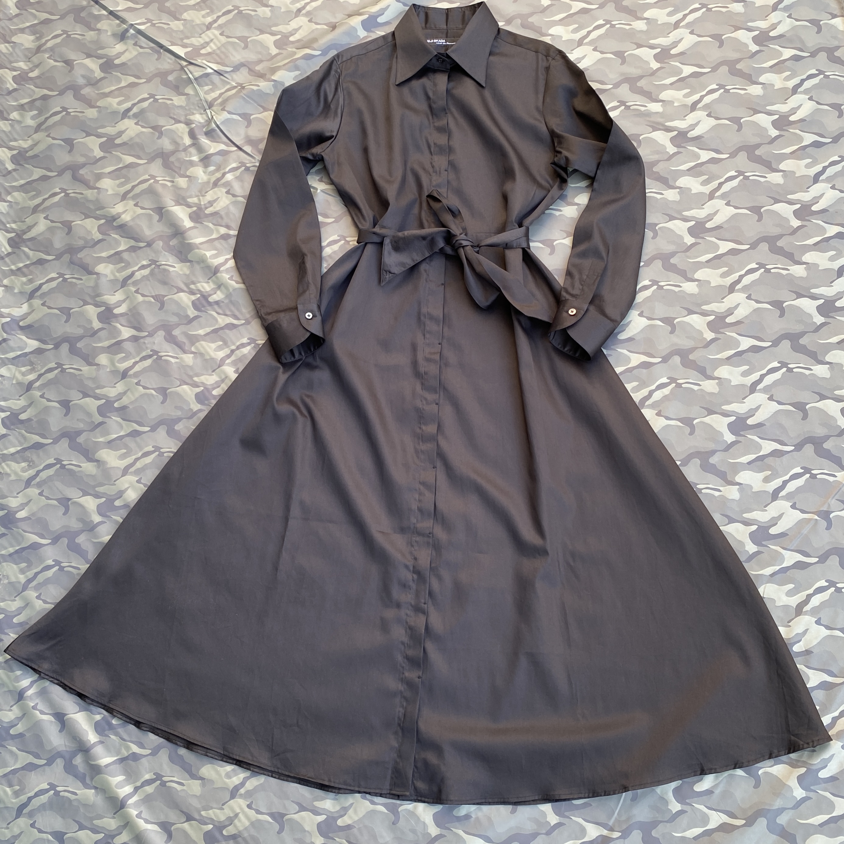 デザインは「ロングレギュラーカラー + 大丸シングルボタンカフス + フライフロント(比翼仕立)+ 胸ポケットレス仕様 + サッシュベルトつき」でお作りしました。