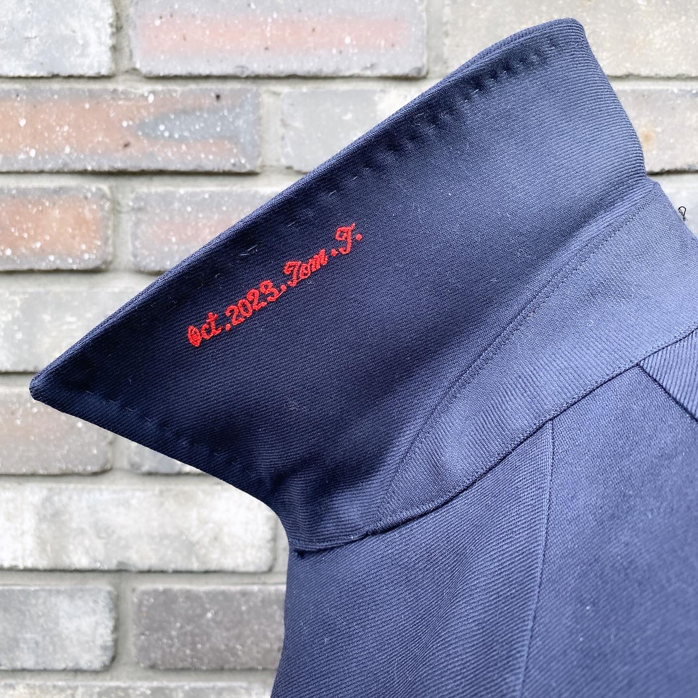 T様はいつもカラー裏にご注文月の刺繍をレッド糸でお入れになります。
