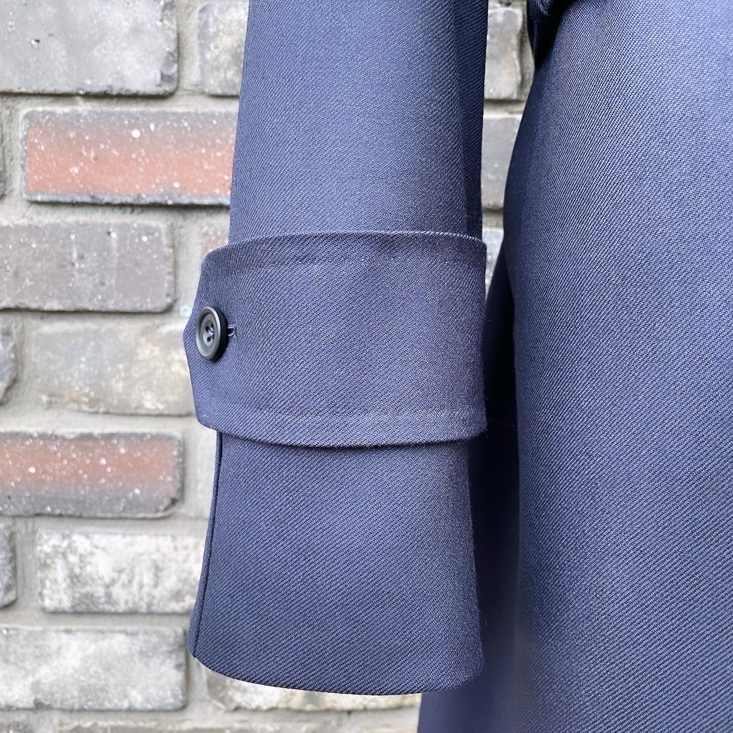 デザインは正統派バルマカーンコートスタイル、「やや大きめなセミステンカラー」「ラグランスリーヴ」「フライフロント(比翼仕立)」「フラップ付きの袖口」「美しいAラインシルエット」がその特徴です。